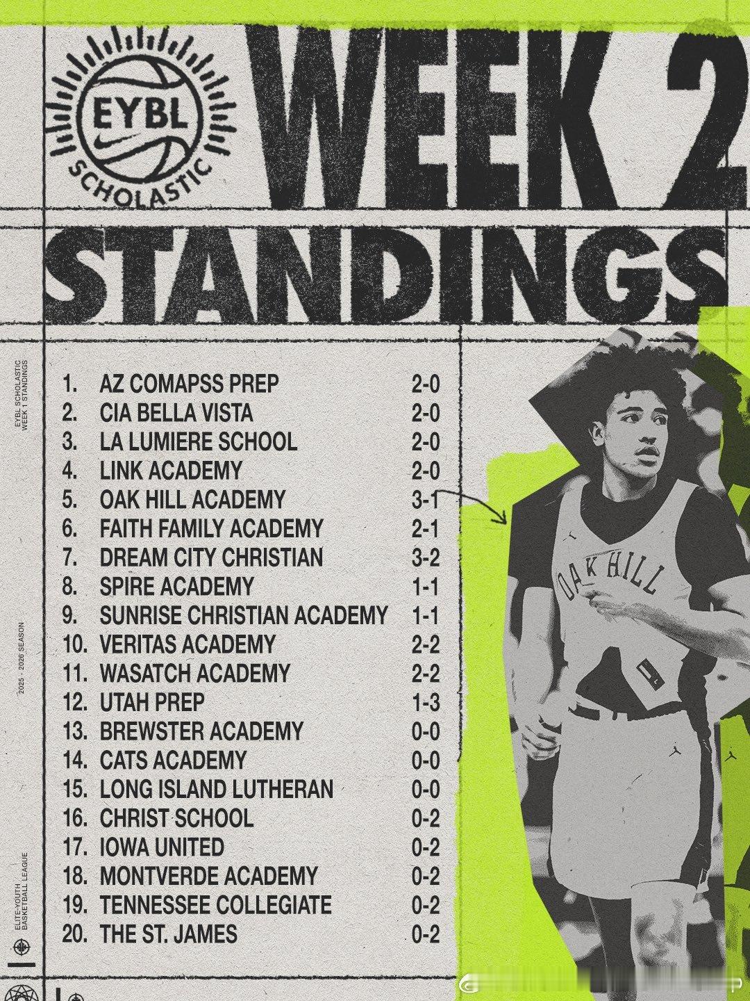 耐克EYBL Scholastic联赛第二周排名,张博源所在的Veritas学院以2胜2负战绩排名第10位,张博源的个人在球队的表现同样亮眼NCAA张博源中国男篮