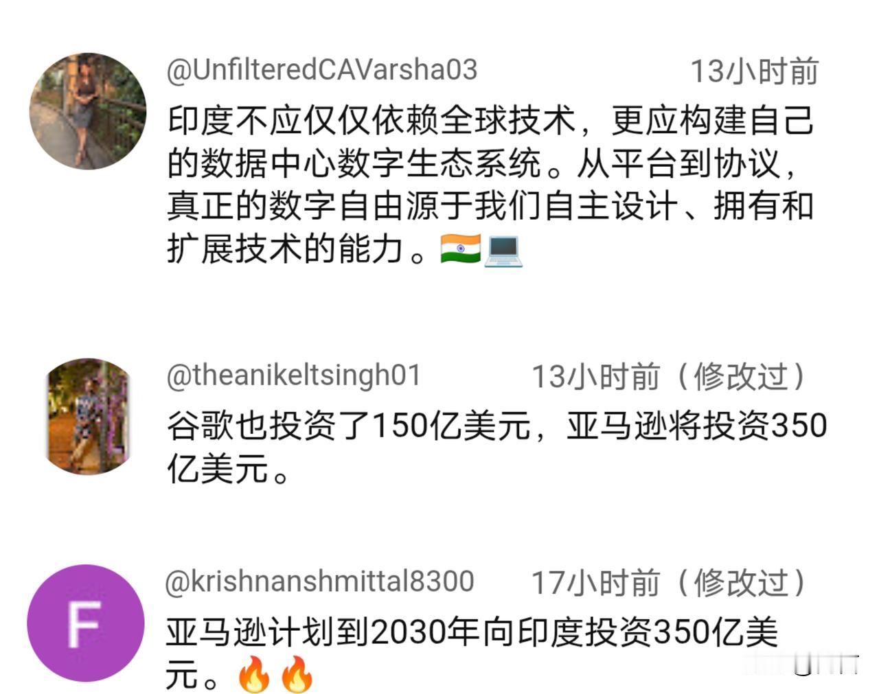 两巨头投资数百亿美元!印网友:印度将成为科技界的领头羊。 据数家印媒12月10日报道,微软和亚马逊将于2030年之前在印度投资525亿美元。其中,微软的175亿美元将重点用于建设位于海德拉巴的数据中心和云基础设施;而亚马逊的375亿美元,则涵盖了AI 、物流和电商等。两者预计将为印度创造100万个就业岗位。 值得注意的是,俄印共同宣布将两国的合作关系提升至一个新的高度还没几天,美国的两家巨头就向印度承诺投资数百亿美元,除了看中了其庞大的市场和丰富的劳动力资源外,想借机进一步拉拢印度,以避免彻底倒向俄罗斯。 闻讯后的印度网友自然是高兴,认为有了美国的帮助,印度科技将会迅速崛起,甚至会成为领头羊。当然也有不同声音,表示印度应该靠自身发展,而不是外国公司…