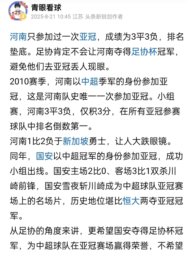 3个月前,青眼看球就发文分析,河南肯定拿不了足协杯冠军,冠军肯定是北京国安。因为足协非常重视亚冠,不可能让中超第10名去踢亚冠。 从足协杯决赛的裁判尺度来看,对河南极为不利,主裁判高亨进潘给了北京国安两个点球。结合中超联赛的点球案例,这两个点球都有不判的依据。第一个球可以参考艾堃在成都的判罚,第二球就是简单的剐蹭,没什么可说的。 曹永竞踩踏王国明,是可以直接红牌的,但高亨进只给了黄牌。王国明扑出的点球,是可以有效的,但高亨进让重罚。 这些现象,都印证了我之前的猜测。 韩国联赛也不希望联赛排名低的球队拿了杯赛冠军打亚冠。 韩国杯赛冠军如果不是联前四名,只能打亚冠二级联赛,不能打亚冠精英联赛。
