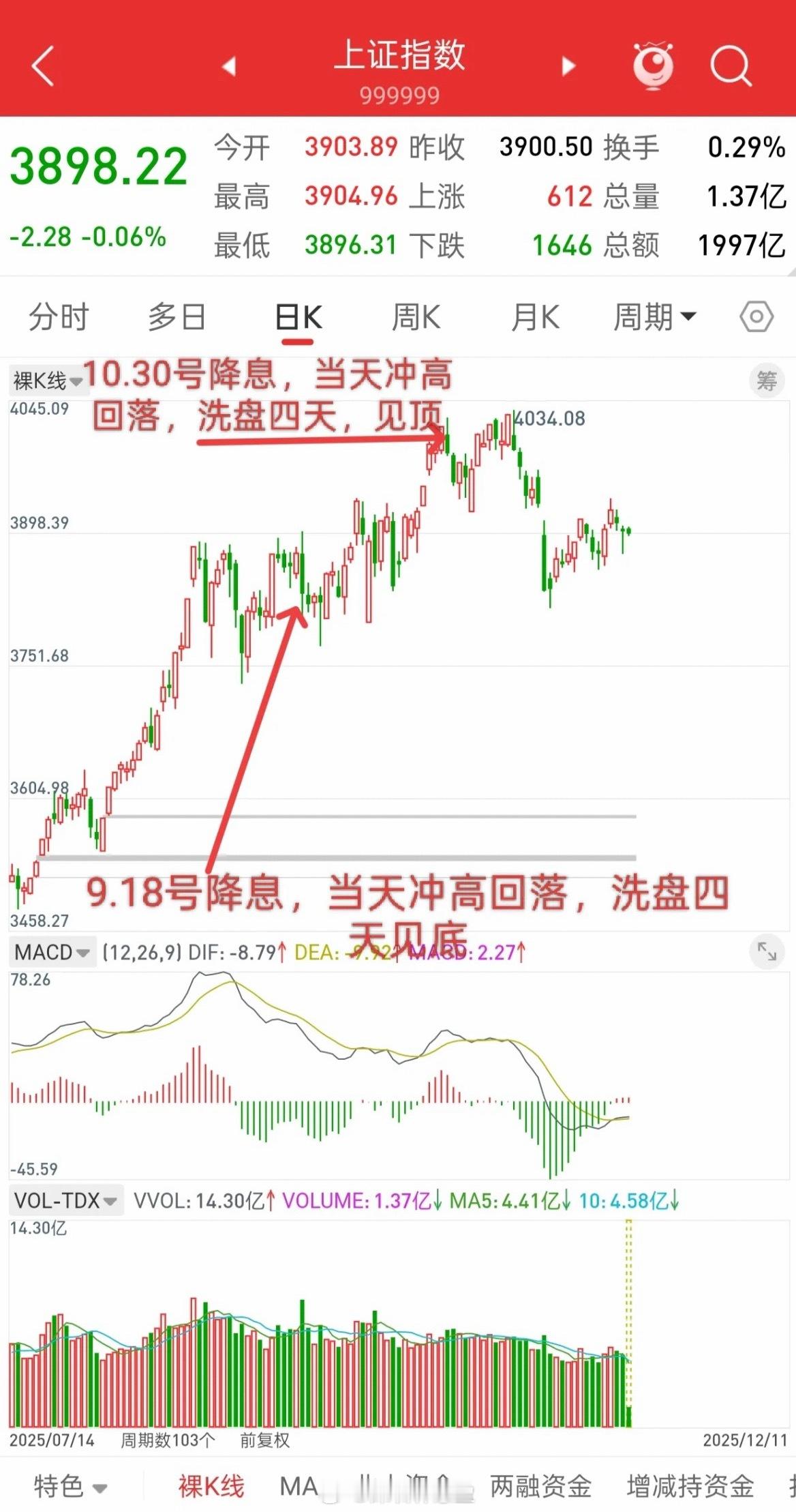 A股,重磅会议第一天,历史是否会惊人的相似!先说观点,9.18号美联储降息,A股当天冲高回落,上午十点半前见高点3899,随后洗盘四天,见底3774,然后,开启新一波反弹。10.30号美联储降息,A股当天冲高回落,也是上午十点半左右见高点4025,随后洗盘四天,见底3922,然后,开启新一波反弹。降息是利好股市,但是,大部分情况是先冲高,再砸盘,砸出一个黄金坑,而降息前就是,拉高,让踏空的人感觉错过好多机会,殊不知,利好落地,大资金兑现。行情会不会复制前面走势,没人知道,但是,做好预期,以及应对方案即可。