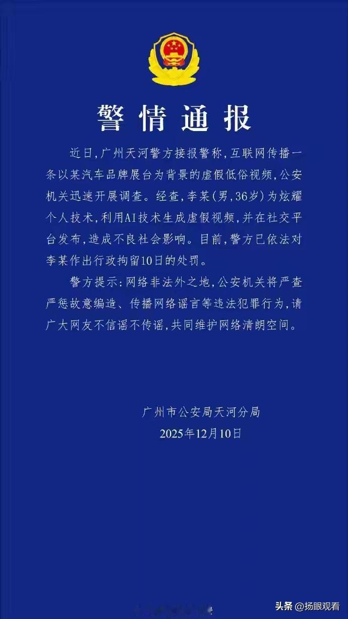AI生成车展低俗视频?男子被拘10天!真不是闹着玩😱 广州警方刚通报!36岁男子李某为炫耀自己的AI技术,竟然合成了小鹏汽车车展的虚假低俗视频,发上网后引发疯狂传播,最终被依法行政拘留10天‼️ 事情要从11月28日说起——那段虚假视频里,背景清晰可见小鹏P7车型和车展展台,看着特别真实,很快就在社交平台和私域疯传。但小鹏汽车当天就紧急辟谣:我们车展根本没邀请模特,这是恶意AI合成的!果断固定证据报了警🚨 警方只用13天就破案了!经查李某就是单纯想炫技,用开源软件抓了车展照片,再通过深度伪造技术合成视频,就为了在技术论坛博关注。可他没想到,这波操作不仅污染网络空间,还侵犯了企业合法权益,直接踩了法律红线! 💥 这些知识点一定要记牢: ❶ 别以为AI生成内容就没人管!《生成式人工智能服务管理暂行办法》明确,使用者要对内容合法性负责,违法照样追责; ❷ 类似案例早就有了:有人用AI写色情小说、做换脸淫秽视频,都被判刑了,情节严重可构成刑事犯罪; ❸ 网络不是法外之地,编造传播虚假信息,轻则行政拘留,重则追究刑事责任。 现在AI技术越来越普及,但绝不能拿来干缺德事!以后刷到劲爆视频先别急着转发,多留个心眼辨真假,别一不小心成了谣言的帮凶。