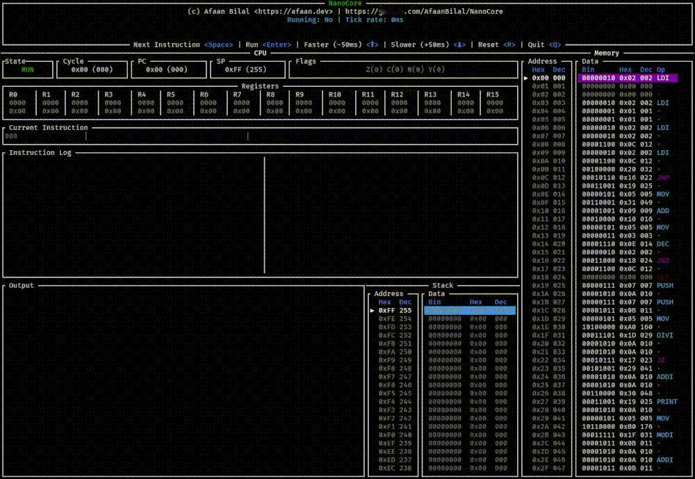 github.com/AfaanBilal/NanoCore教学项目NanoCore,这是一个8位CPU模拟器,该CPU以极简主义为设计理念,运行在严格的256字节内存空间中,所有寄存器、程序计数器(PC)和栈指针(SP)都是8位的。项目用来帮助理解计算机架构的基本原理、低级指令集设计、在严苛约束下的内存管理以及汇编语言编程。科技先锋官