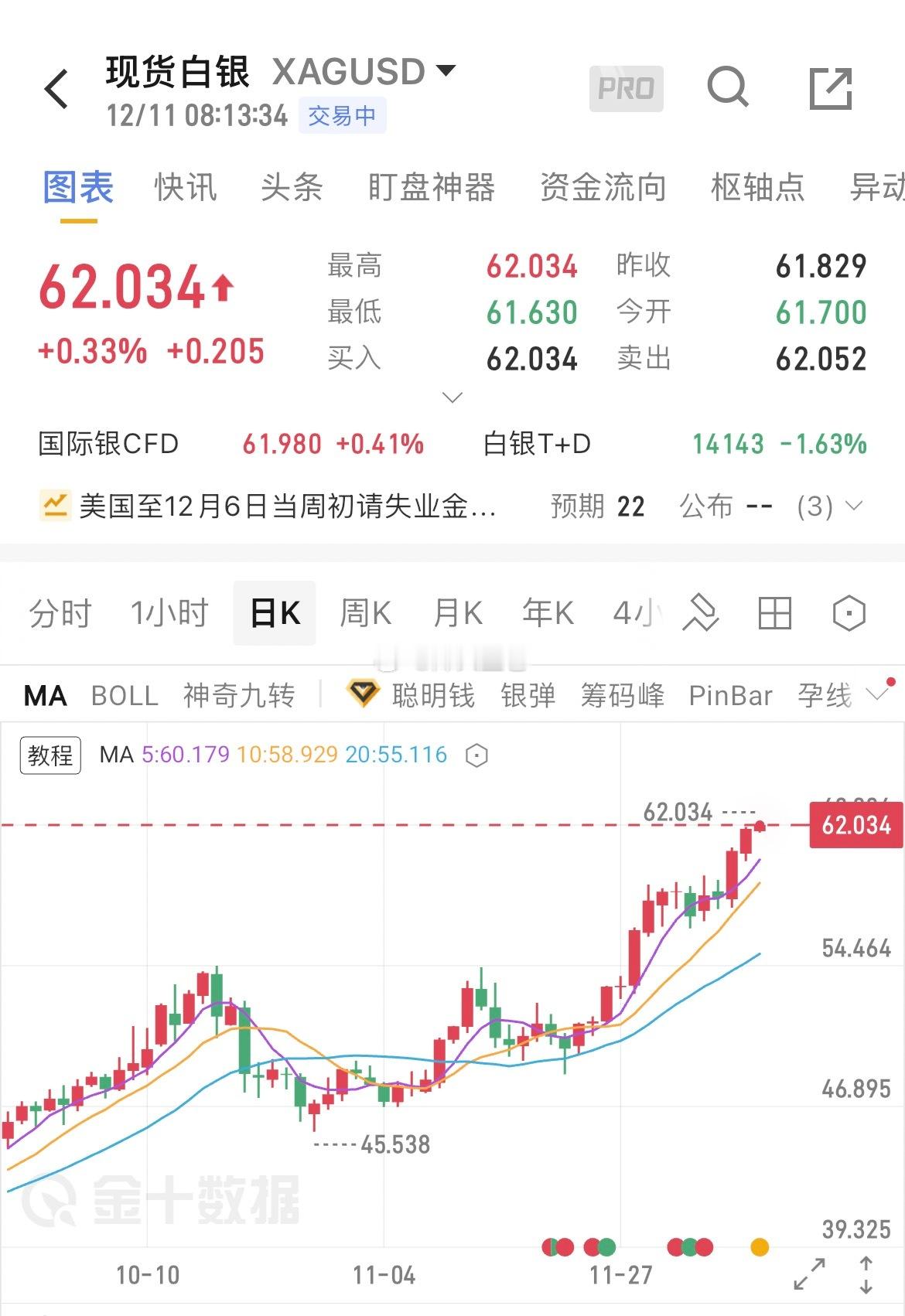 金十数据12月11日讯,现货白银在周四早盘突破62美元/盎司,再创历史新高,今年累计涨幅扩大至114%。金银比年跌幅扩大至近25%。(来自金十数据APP)
