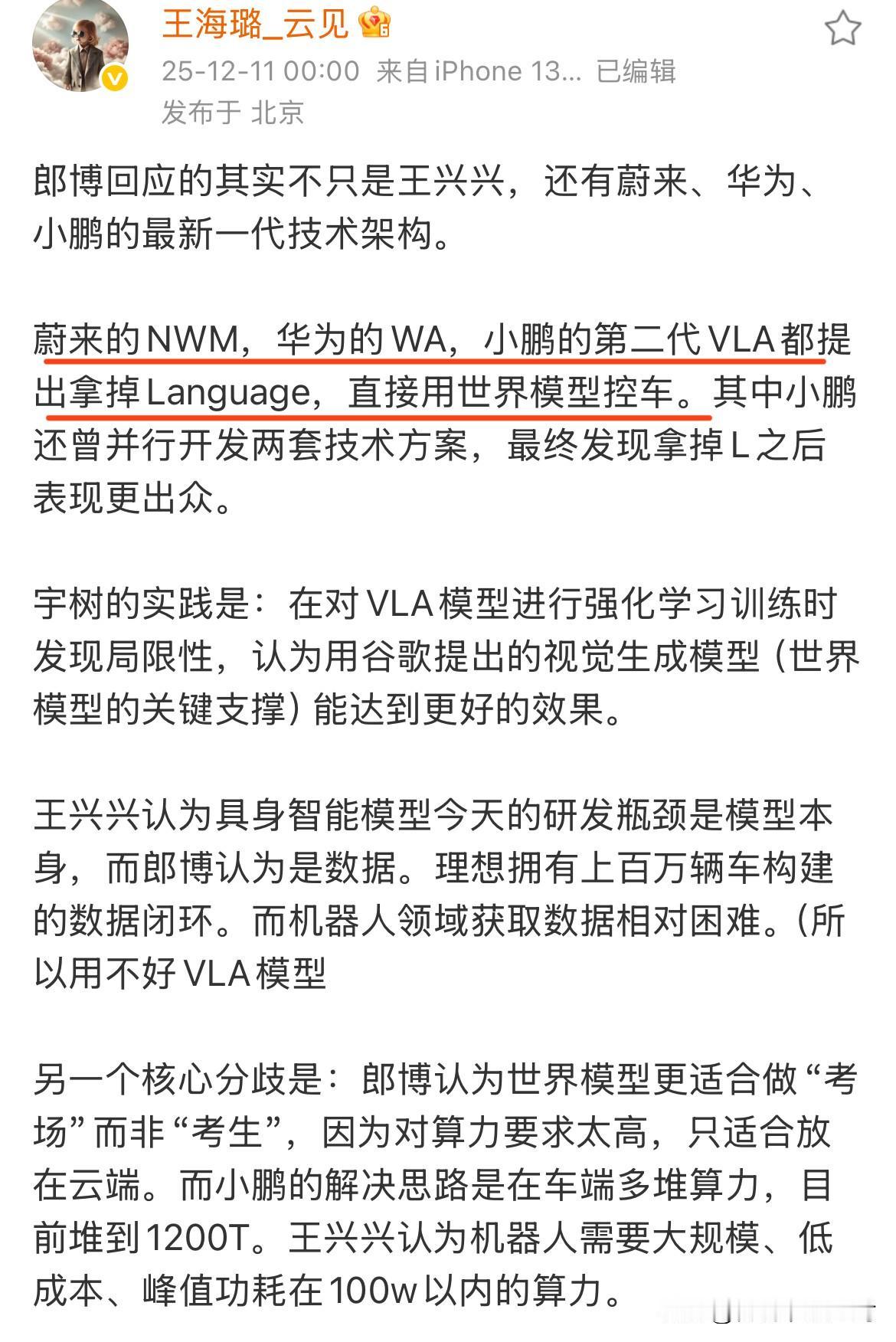 关于VLA与世界模型路线之争。 看起来,理想似乎成了选择VLA的少数派。 但是,其实我觉着现在说这些不太重要,因为现阶段“辅助驾驶大家都是第一梯队”,拉不开体验的差距,也就无法证伪或证实。 重要的是各家新版本上车后的实际体验…… 就像FSD V12、V13和V14一样,只要研发在正确的道路上,每次版本升级都会带来车主自动驾驶体验的跃升,尤其是这次V14,就像打开了新世界的大门。 那么,用了最新VLA模型的理想的8.1有没有类似这种体验的跃升? 一季度,小鹏的“VLA2.0”也会推送,到时看看“拿掉L”的“二代VLA”,有没有过人表现就一切都明了了。 我是坚信明年一季度,国内辅助驾驶会出现明显分野的,究竟孰是孰非,到时候看上车效果……