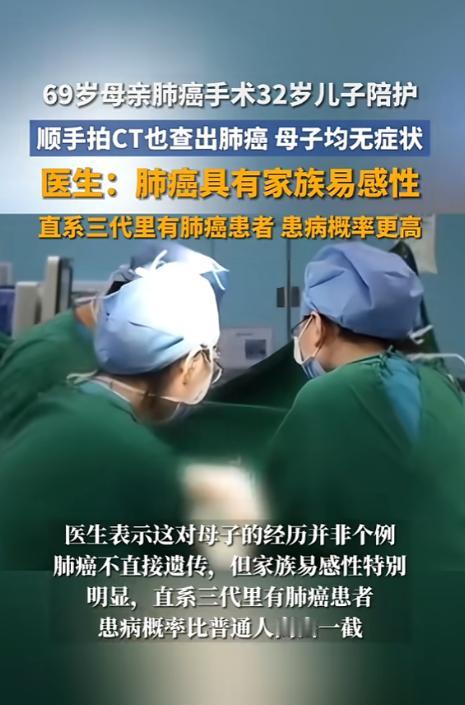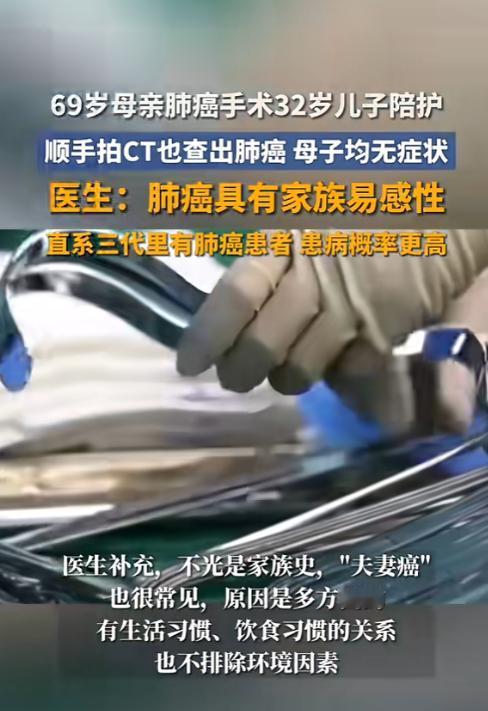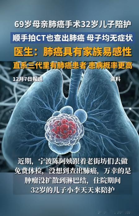 “太可怕了!”浙江宁波,一老人去体检,没想到竟查出肺癌,住院治疗后,32岁的儿子天天在医院陪护,顺便也做了个体检,发现竟然和母亲一样患了肺癌,令人疑惑的是,母子二人之前均没有不适症状,医生的解释令人意外! 一名年轻小伙陪母亲住院,顺手查了个体检,结果自己也被确诊早期肺癌,宁波这事儿,看完真让人后背发凉。 李阿姨 (化名)63岁,身体一直硬朗,平时连个咳嗽胸闷都没有,要不是女儿催着做例行体检,她压根没想着去医院,谁能想到,毫无征兆的检查,查出了肺部阴影,进一步检查下来,肺癌。 老太太当场就懵了,嘴唇哆嗦着,还好医生说发现得及时,随后他的小李(化名)放下工作,全程在医院陪护,白天跑手续,晚上守病床,后来母亲的身体情况有了好转之后,小李想着自己反正也在医院,干脆趁方便也做个全面检查。 一方面省得再专门跑一趟,另一方面,母亲的病让他心里总有点打鼓,查完也能安心,体检报告出来,右肺有个小结节,医生让三个月后复查,小李嘴上说着没事,心里却压了块石头。 三个月后按时复查,医生看了片子眉头一皱,让他做更精细的检查,最终结果出来,早早期肺癌,小李差点没坐稳,脱口而出的话和母亲当初一模一样,“怎么可能? 这时候他才真正明白,有些病根本不打招呼,等有感觉的时候,往往就晚了,医生说,肺癌、肝癌这些大病,刚开始的时候根本就没有什么异常的症状,一般人就不会在意,但从症状出现开始,就很有可能错过了最佳时间。 很多早期病例,都是靠体检 “捡” 回来的,原本有点疏离的一家人,因为这场意外反而靠得更近,平时互相打气,陪着对方做治疗。 网友看完都炸了,好多人说自己身边也有类似情况,有人说 “无症状不代表没病,体检真的不能省”,还有人看完立刻给父母打了电话,催他们去预约体检。 也有人感慨,别觉得年轻就可以任性,32 岁也照样不能大意,现在的人,生活节奏快,压力又大,总觉得身体扛得住,就算有点小不舒服也不当回事,可那些藏在身体里的隐患,不会因为你年轻就手下留情,也不会提前敲警钟。 那么通过这件事情也让我们明白了,健康才是最重要的,真的,体检从来不是多此一举,花点时间,花点小钱,换一份安心,甚至可能挽回一条命,这大概是最划算的投资了。 信息来源:齐鲁晚报