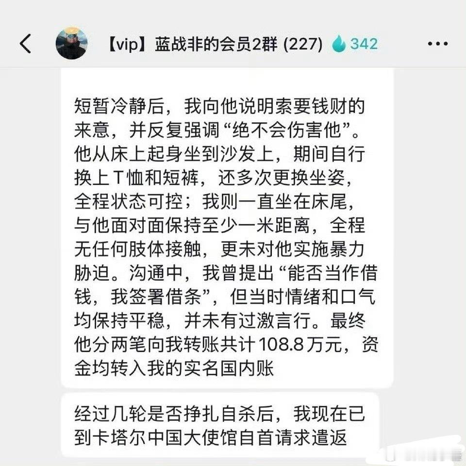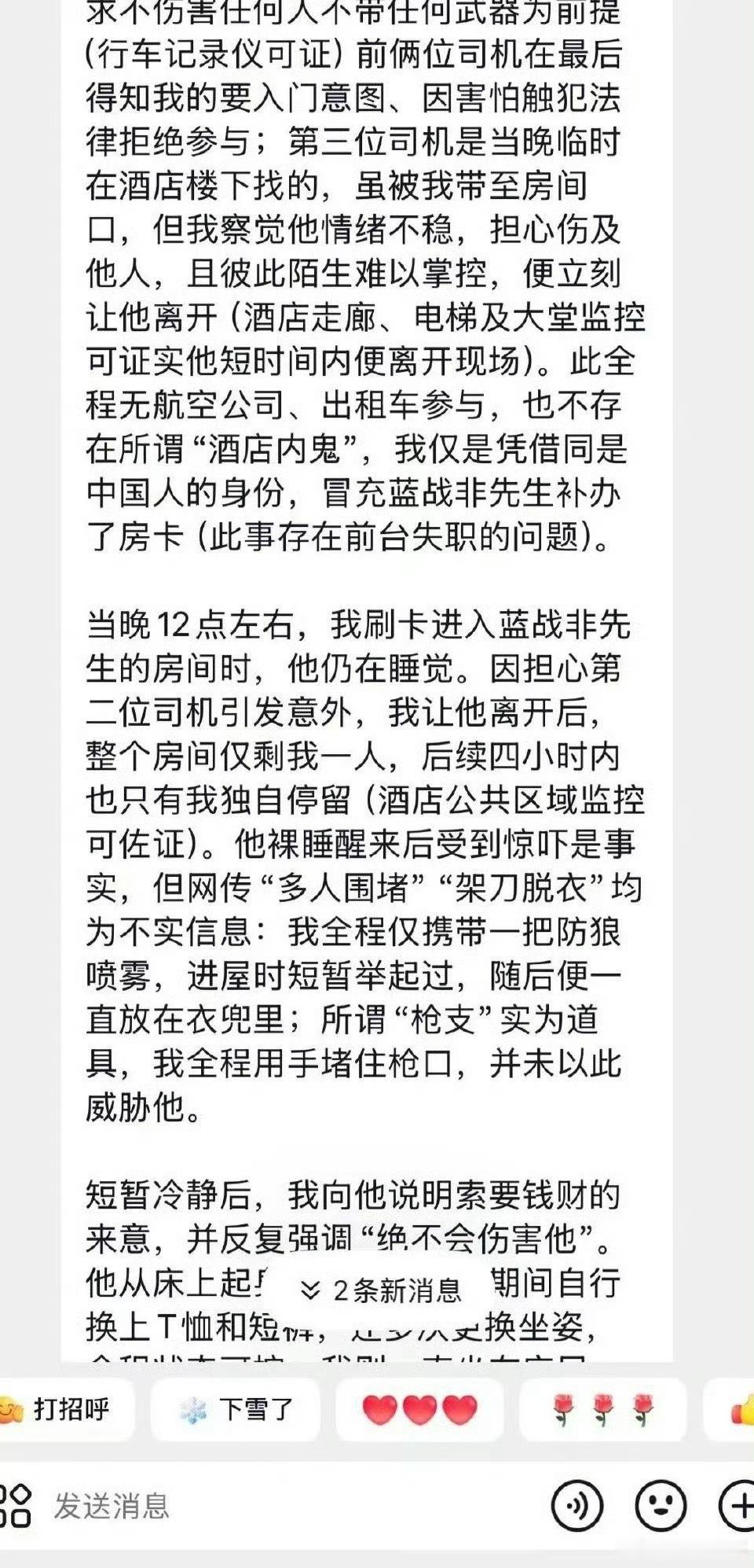 疑似绑架蓝战非的人自首千万粉丝博主蓝战非南非遭绑事件再生转折,疑似绑匪在粉丝群“自首”的消息引发轩然大波。一边是博主所述“持刀胁迫、伪造案件”的惊魂经历,一边是自称嫌疑人“无暴力、临时起意”的辩解,双方说法大相径庭,真相仍笼罩在迷雾中。姑且不论声明真假,“炒股负债”绝不能成为绑架勒索的借口。即便如声明所言仅用防狼喷雾,闯入他人房间索要百万钱财的行为,已然触碰法律红线,绝非“借款”那么简单。网络发声成本低,仅凭千字声明难以还原全貌,酒店监控、资金流向等客观证据才是关键。海外中国公民安全事件始终牵动人心,在信息碎片化的当下,我们更需保持理性,静待中外警方的联合调查与官方通报。无论最终真相如何,任何试图以非法手段解决问题的行为,都必将受到法律的严惩,这是不容置疑的底线。