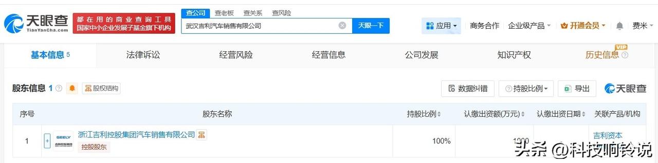 【吉利汽车在武汉成立新销售公司 注册资本1000万】 天眼查App显示,近日,武汉吉利汽车销售有限公司成立,法定代表人为娄源发,注册资本1000万人民币,经营范围包括汽车零配件批发、汽车零部件及配件制造、新能源汽车整车销售等,由浙江吉利控股集团汽车销售有限公司全资持股。 天眼查信息: