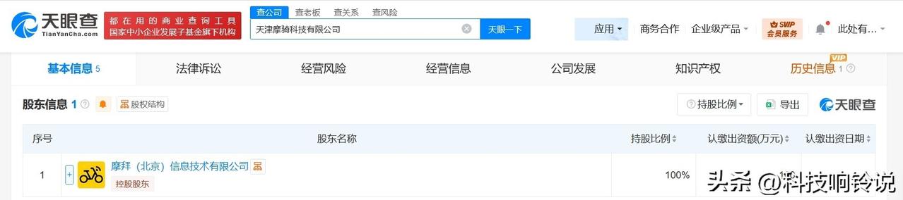 【摩拜在天津成立摩骑科技公司 注册资本100万】 天眼查App显示,近日,天津摩骑科技有限公司成立,法定代表人为孙可青,注册资本100万人民币,经营范围含软件开发、网络与信息安全软件开发、信息技术咨询服务、信息咨询服务、互联网数据服务、企业管理咨询、供应链管理服务、共享自行车服务、租赁服务等,由摩拜(北京)信息技术有限公司全资持股。 天眼查信息: