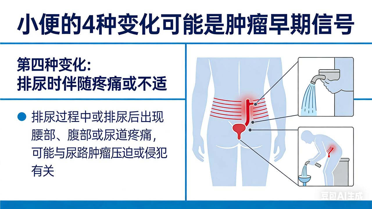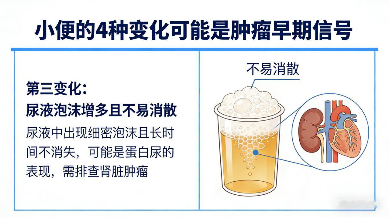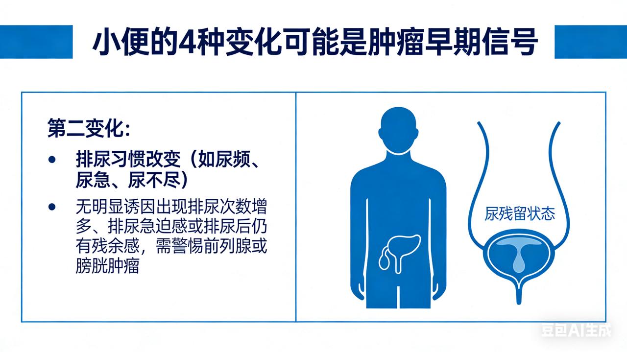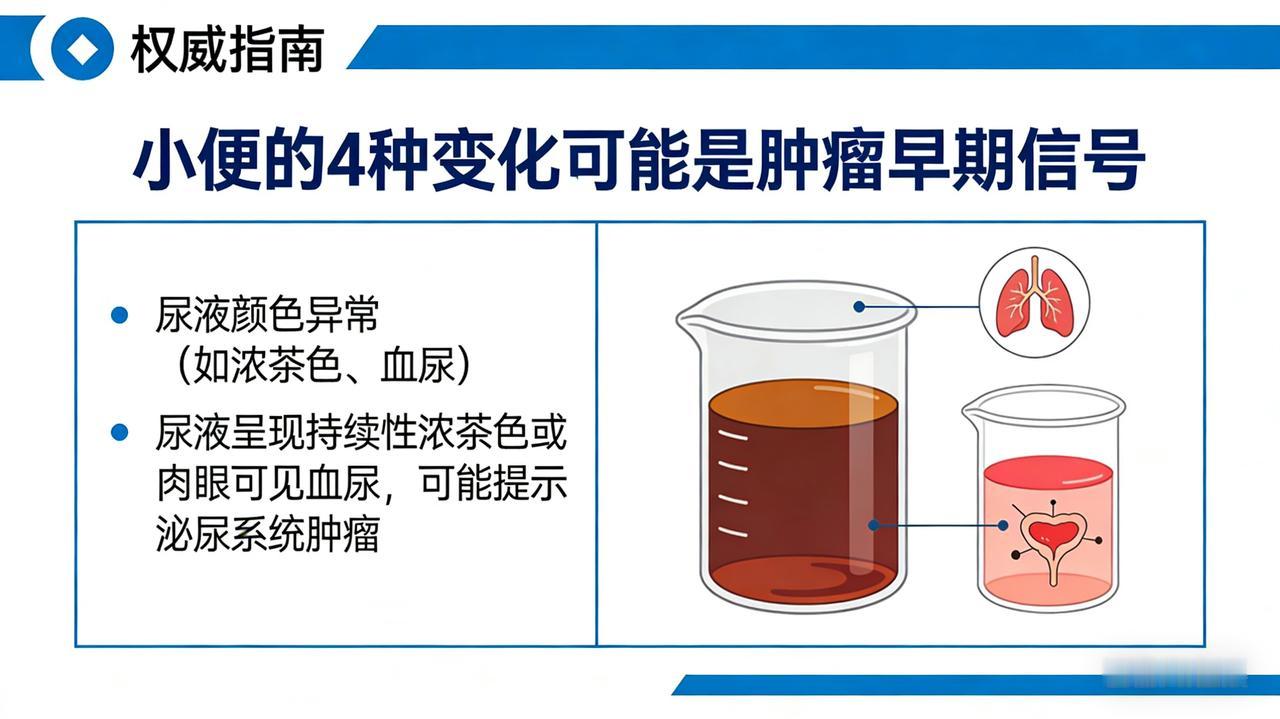 权威指南:小便这 4 种变化,可能是肿瘤早期信号 小便异常:肿瘤的隐形警报——四大症状揭示体内癌变风险 尿液作为人体代谢的“生物标志物”,其细微变化往往隐藏着肿瘤的早期信号。医学界通过最新研究证实,泌尿系统肿瘤、肝胆恶性肿瘤及转移性肿瘤常通过尿液异常发出警示,以下四种异常需高度警惕,结合2025年最新临床数据与权威指南,为您深度解析: 一、无痛性血尿:泌尿肿瘤的“红色警报” 据国家癌症中心2022年数据,我国膀胱癌年新发病例达8.2万例,其中80%以上患者首发症状为无痛性肉眼血尿。这种血尿呈淡红、洗肉水样或含血块,无疼痛感,易被误认为“上火”或“尿路感染”。2025年EAU大会公布的研究显示,ctDNA液体活检在膀胱癌早期诊断中敏感性达69.7%,结合膀胱镜可精准定位肿瘤。肾癌患者同样需警惕间歇性血尿,CT尿路造影可清晰显示肿瘤与肾盂、输尿管的浸润关系。 二、排尿习惯剧变:肿瘤压迫的“刺激信号” 前列腺癌晚期因肿瘤侵犯尿道,常引发排尿困难、尿流变细甚至尿潴留。63.2%的前列腺癌患者在确诊前6个月已出现夜尿增多(超过3次/夜),且夜尿次数每增加1次,前列腺问题风险上升19.7%。膀胱癌浸润膀胱三角区时,会引发膀胱过度活动,表现为尿频、尿急、尿痛。2025年ESMO大会指出,PSMAddition1研究证实177Lu-PSMA-617联合治疗可显著改善转移性激素敏感性前列腺癌患者的无进展生存期。 三、尿液性状异常:代谢紊乱的“生化密码” 尿液呈深茶色或酱油色,提示肝胆系统肿瘤导致胆红素代谢异常;泡沫尿持续不消散需警惕肾癌或多发性骨髓瘤引发的蛋白尿,GAGome评分作为尿液代谢组生物标志物,对预测术后高危肾癌患者早期复发的阴性预测值超过97%。尿液腐败恶臭可能与膀胱癌晚期感染相关,而甜味尿则提示糖尿病合并肿瘤代谢异常。2025年膀胱癌诊疗指南强调,尿液NMP22检测联合BTA试验,可将早期诊断敏感度提升至85%。 四、尿量异常波动:肾功能受损的“隐性指标” 肿瘤压迫输尿管或尿道时,可能引发尿量骤减、排尿中断;肾癌晚期侵犯肾盂可导致肾积水、少尿甚至无尿。我国肾癌5年生存率达69.8%,但农村地区发病率年增幅达13.5%。夜尿增多超过3次/夜需排查前列腺癌、膀胱癌或肾肿瘤转移,2025年国家癌症中心报告指出,通过“互联网+癌症筛查”平台,84万群众已完成癌症筛查风险评估,早期诊断率提升23%。 早期干预:守护生命的黄金窗口 建议40岁以上高危人群(长期吸烟、化工从业者、有肿瘤家族史者)每年进行尿常规、泌尿系超声及肿瘤标志物检测。出现上述异常时,应避免自行用药掩盖症状,及时至肿瘤专科进行膀胱镜、CT或MRI检查。早期肿瘤通过手术、免疫治疗等综合手段,5年生存率可达80%以上。世界卫生组织强调,规范筛查可使肺癌死亡率降低20%,这一原则同样适用于泌尿系统肿瘤。 尿液的细微变化是身体发出的“求救信号”,重视这些预警,结合权威指南与最新研究成果,才能把握肿瘤防治的黄金时机,守护生命健康。