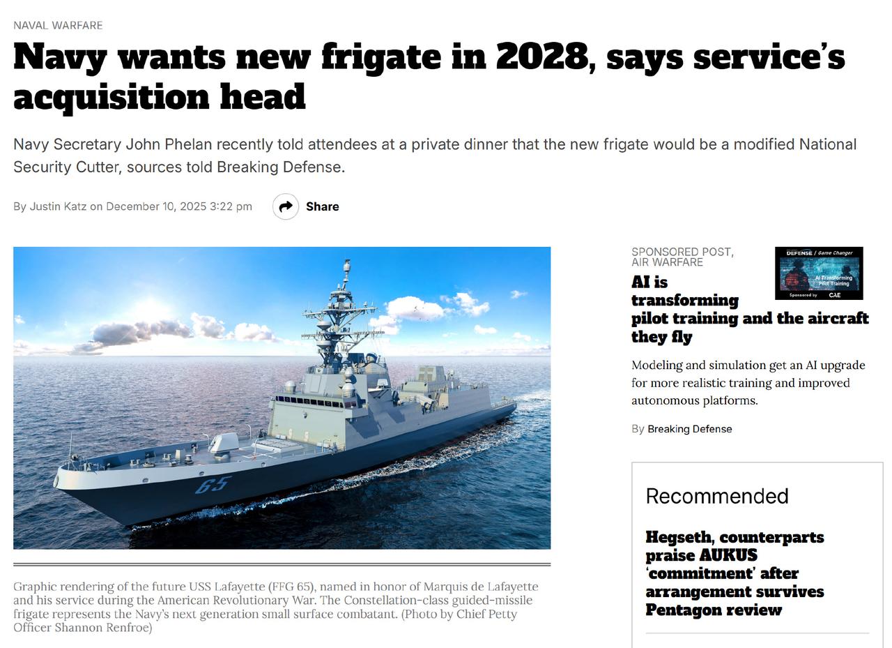 采用传统桅杆布局?美国海军部长宣称,希望新型护卫舰(替代“星座”级)首舰能在28年下水,并透露新护将以“传奇”级巡逻舰为基础设计。