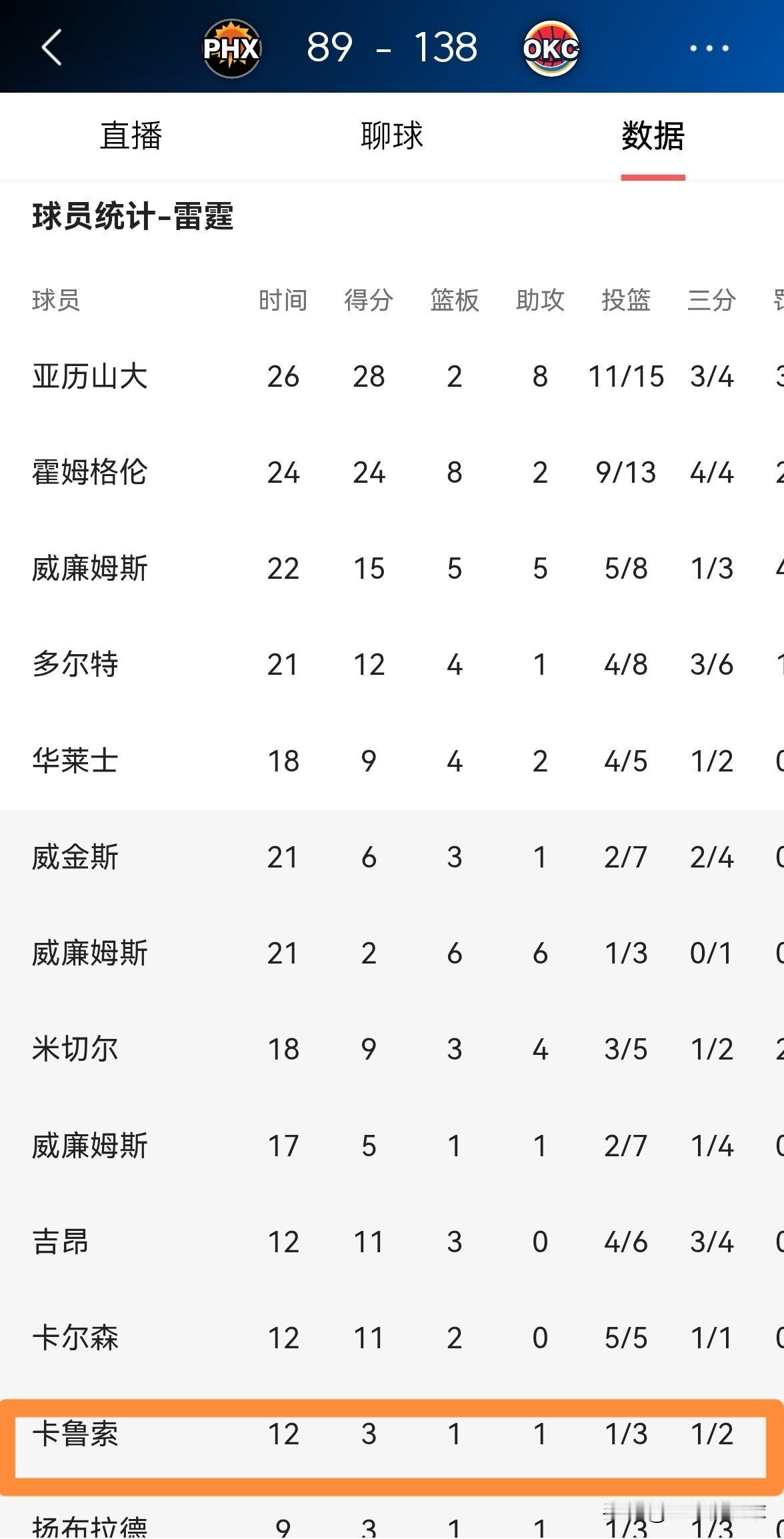 雷霆老将卡鲁索真是太会划水了!在今天雷霆主场以138:89大胜太阳的比赛中,31岁的卡鲁索替补出战12分钟,投篮3中1,其中三分球2中1仅仅得到3分,他的场上正负值为-3。 毫不夸张的说,由于雷霆的整体实力远远强于太阳,因此本场比赛卡鲁索甚至都没有出汗。