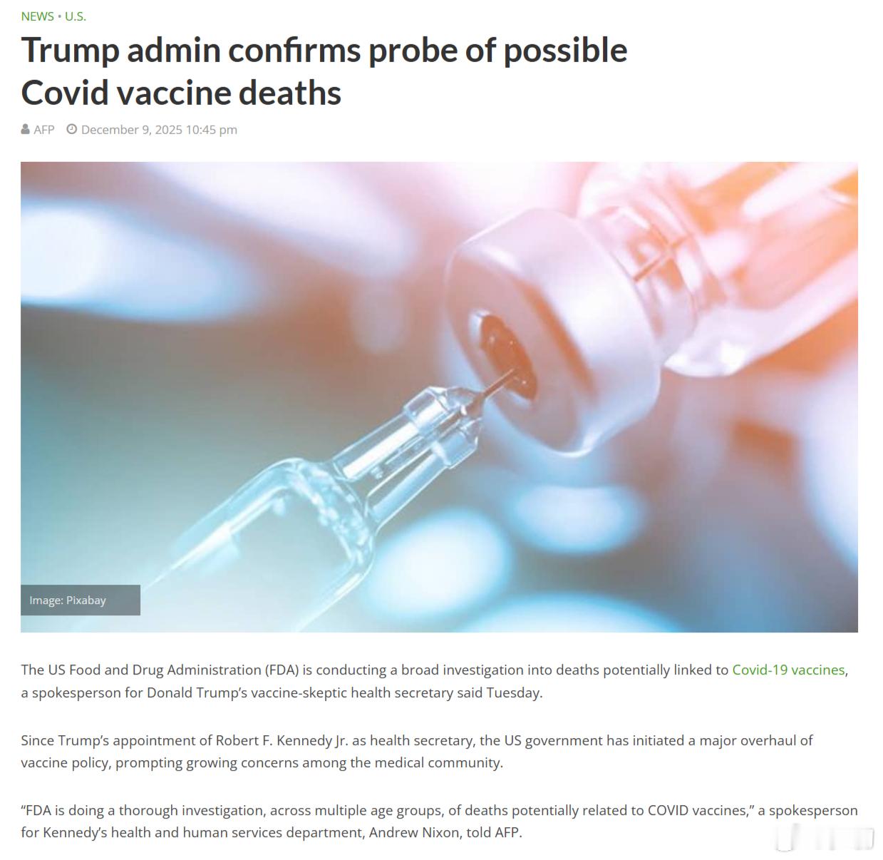 法新社:特朗普政府证实正在调查可能与新冠疫苗相关的死亡事件。美国卫生与公众服务部发言人周二表示,美国食品药品监督管理局(FDA)正在对可能与新冠疫苗有关的死亡事件进行广泛调查。有没有人感觉新冠疫情之后,身体多了好多小毛病,而且以前感冒几天就好,现在常常要一个礼拜甚至两个礼拜才好???