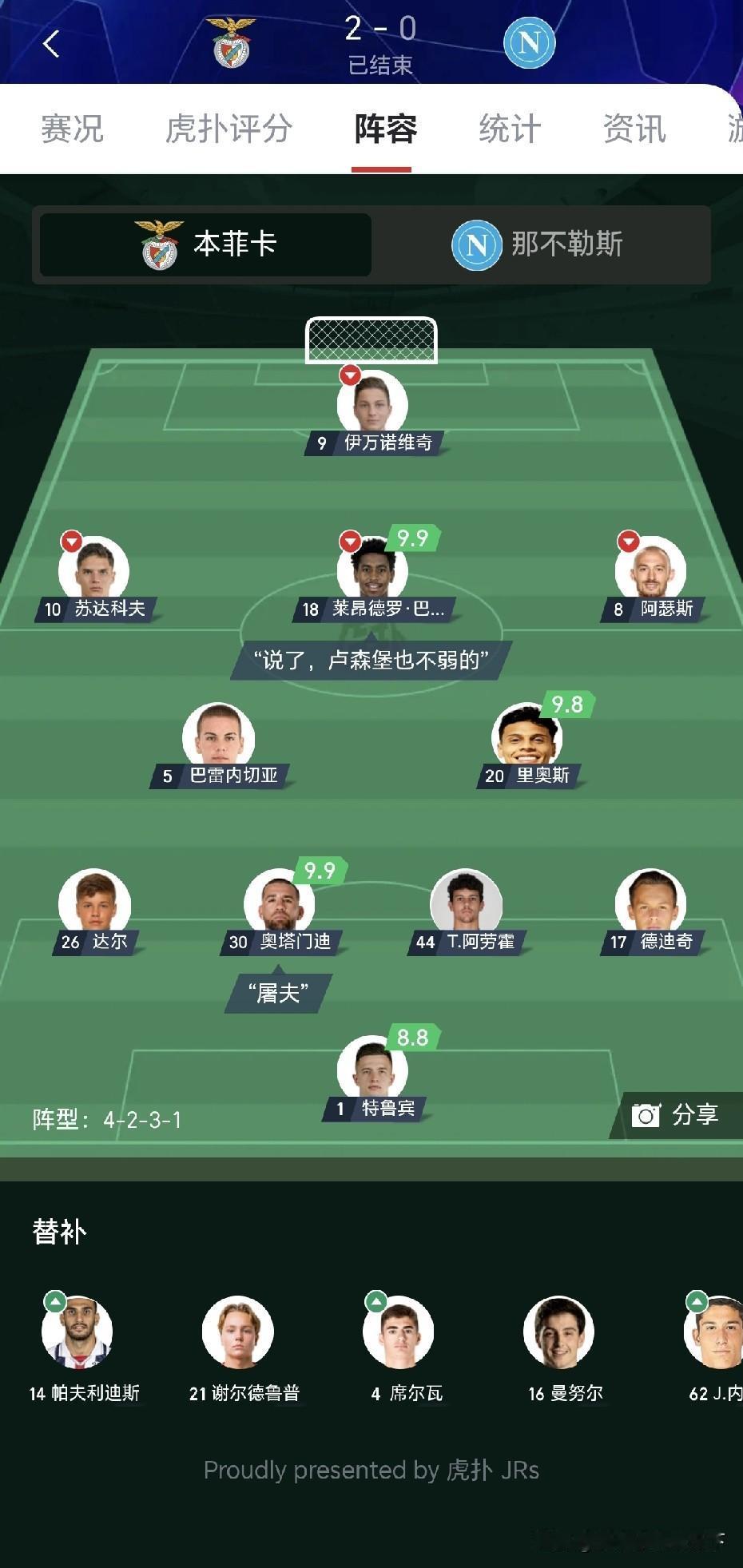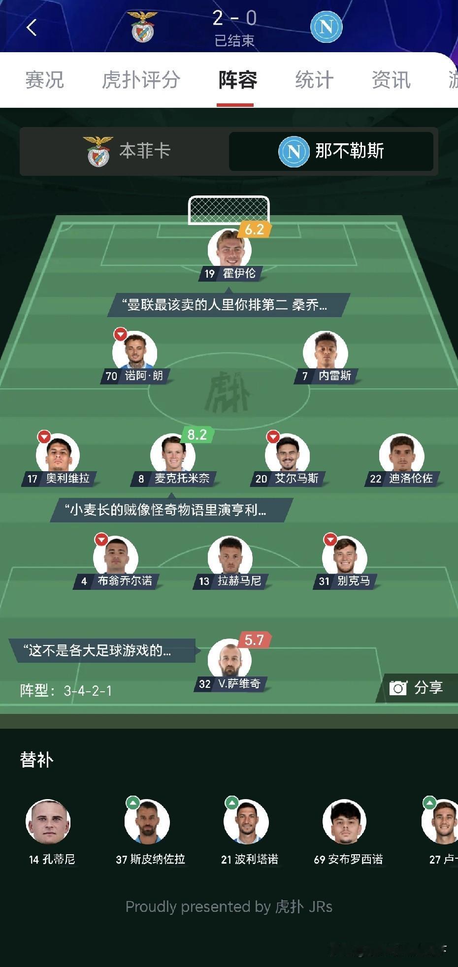 魔力鸟完胜意大利“上港队”!那些说穆里尼奥战术过时的黑子们打脸不? 没想到啊没想到,太出乎意料了,穆帅居然把意甲冠军给干了。这说明穆里尼奥还是强,击败的可是意甲冠军拿波利,在战术上,穆里尼奥真的是完胜孔蒂,孔二愣子,欧冠真的是差。 这下二愣子狂不起来了吧,一个名帅居然只会单线,豪门是没机会了,哪个豪门都是把欧冠放在首位。 今年本菲卡进球后鸟叔那个淡定哦,光看集锦就发现本菲卡浪费了两个必进球机会,不然不止2-0。 建议穆里尼奥别带本菲卡了,快回皇马接班阿隆索吧。