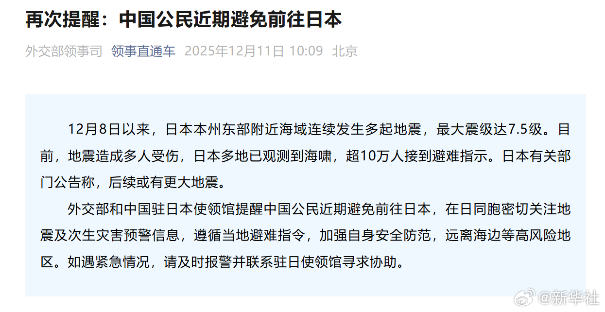 【#外交部再次提醒中国公民近期避免前往日本#】12月8日以来,日本本州东部附近海域连续发生多起地震,最大震级达7.5级。目前,地震造成多人受伤,日本多地已观测到海啸,超10万人接到避难指示。日本有关部门公告称,后续或有更大地震。外交部和中国驻日本使领馆提醒中国公民近期避免前往日本,在日同胞密切关注地震及次生灾害预警信息,遵循当地避难指令,加强自身安全防范,远离海边等高风险地区。如遇紧急情况,请及时报警并联系驻日使领馆寻求协助。(领事直通车)