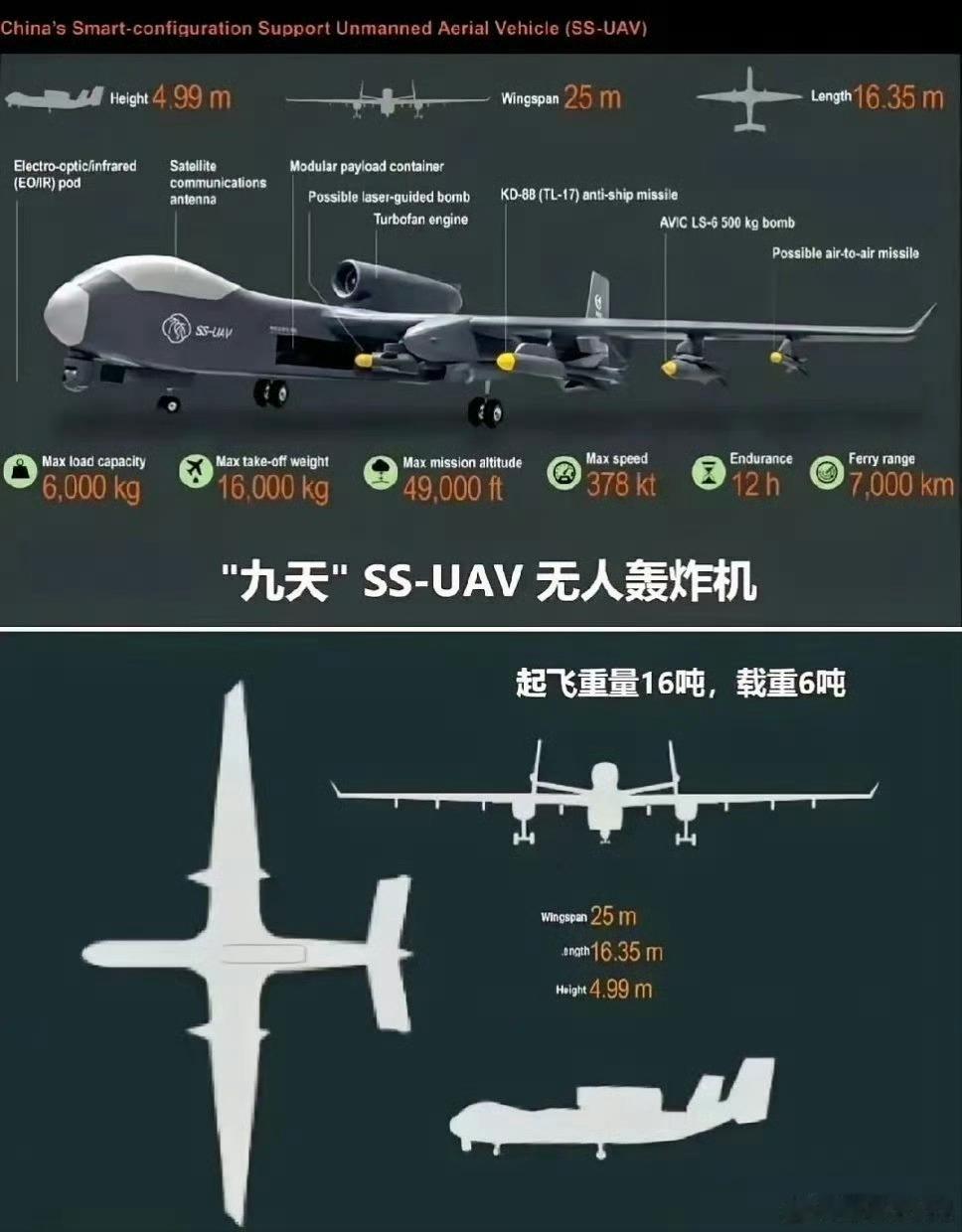 凤舞九天!每天认识一件兵器 2025年12月11日,由陕西无人装备科技有限责任公司委托,航空工业第一飞机设计研究院设计的“九天”无人机在陕西蒲城圆满完成首飞任务。作为我国自主创新的大型通用无人机平台,该机型采用“通用平台+模块化任务载荷”设计理念,依托自主集成技术制造创新图4图5,一机两型(动力)图6,具备大载重、高升限、宽速域、短起降等核心优势。该机长16.35m,翼展25m,最大起飞重量16t,载荷能力达到6t,航时12h、转场航程7000km,性能指标位居同类产品前列。通过模块化任务载荷换装,“九天”无人机可广泛适配民用多元场景:既能承担偏远山区、海岛的重型物资运输与精准物流投送,也能在应急救援中快速恢复通信、投送救灾装备,还可提供地理测绘、灾情评估、矿产普查等服务,覆盖文物勘测、海巡执法、森林灭火等多个国民经济领域。其实所有人更看重的是他强大的火力投射能力,我个人认为很适合作为反潜无人机!烽火问鼎计划九天无人机成功首飞