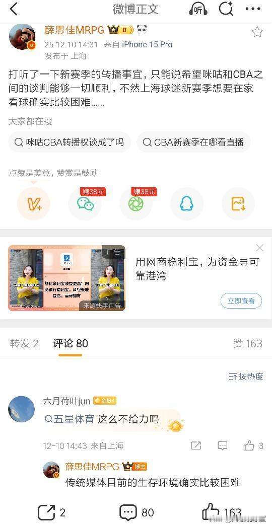 真的太羡慕广东球迷了!虽然咪咕没有视频直播CBA的比赛,只能图文直播,但是广东媒体将继续全程直播CBA的比赛,广东队记关辛透露,广东电视台体育频道一如既往全程直播新赛季广东三队的所有比赛,在这点看来,广东确实厉害,连咪咕都谈不下来的项目,他们仍然拿到转播权,而上海方面也同样陷入困境,上海球迷甚至可能无法在上海电视台五星频道观看上海久事男篮CBA新赛季的比赛,据上海队薛记报道,希望咪咕能与CBA公司谈判成功,获得转播权,否则上海球迷想在家看球就比较困难了,上海五星频道可能都不一定转播上海男篮的比赛,传统媒体目前生存环境太困难了!