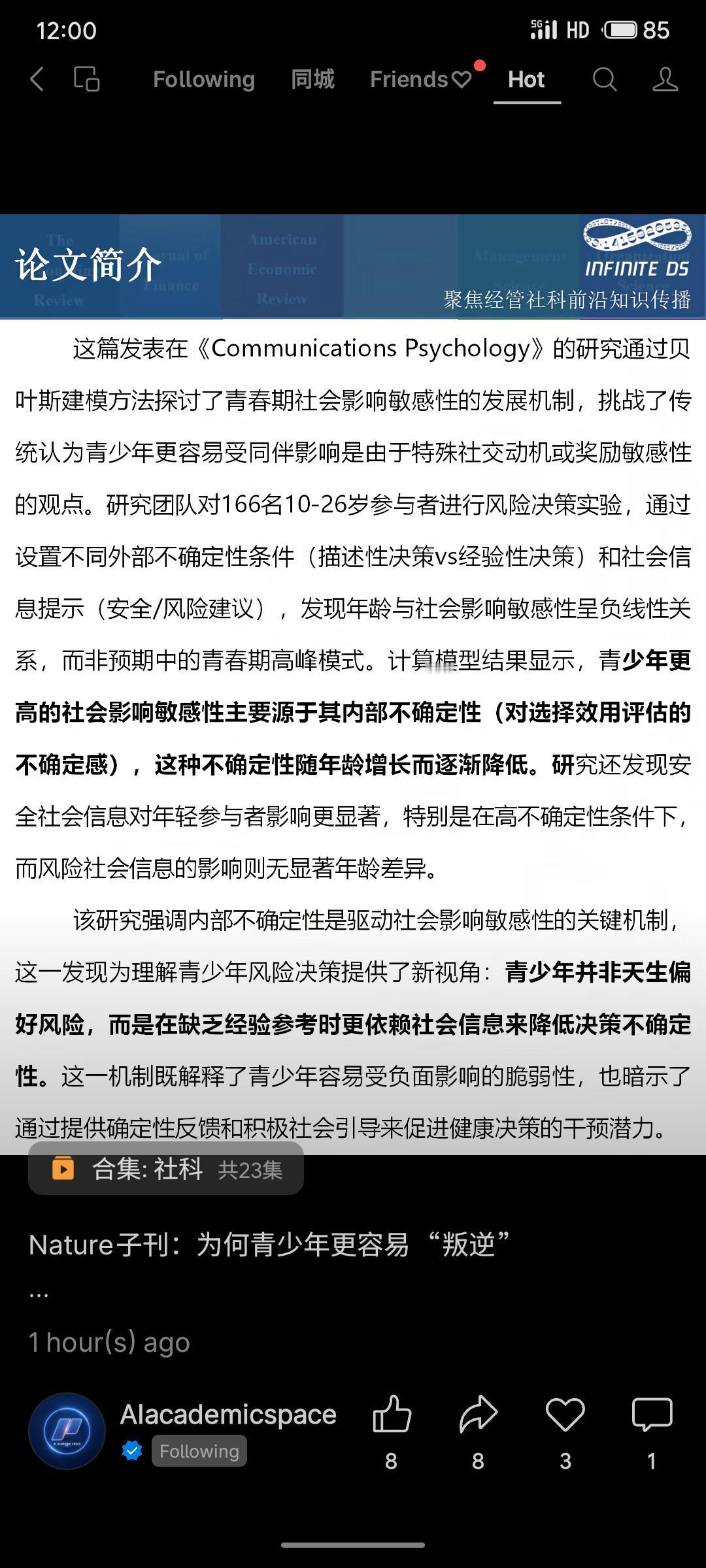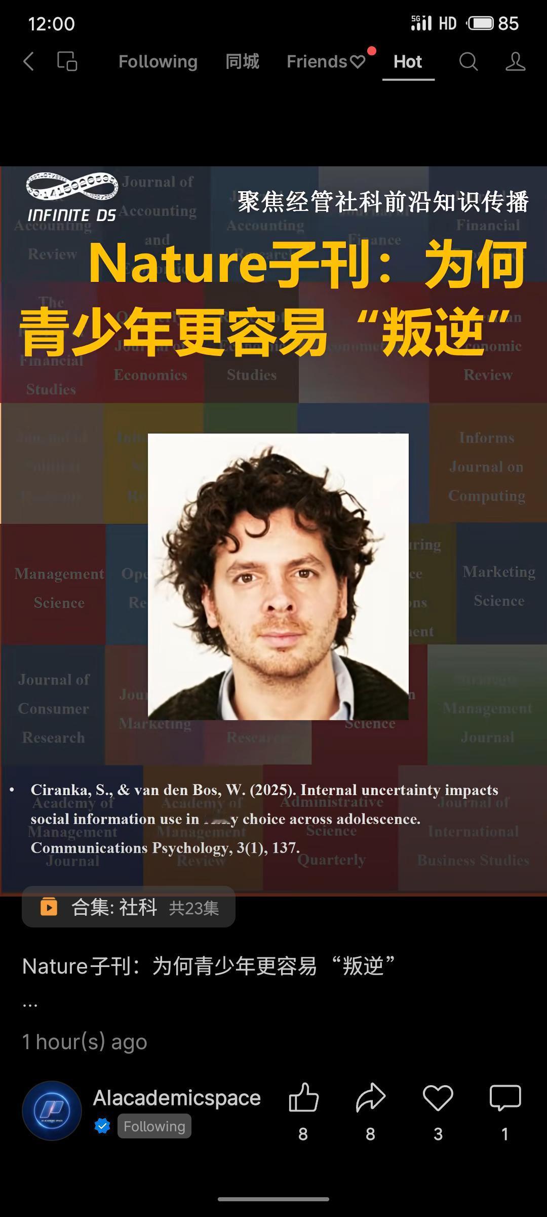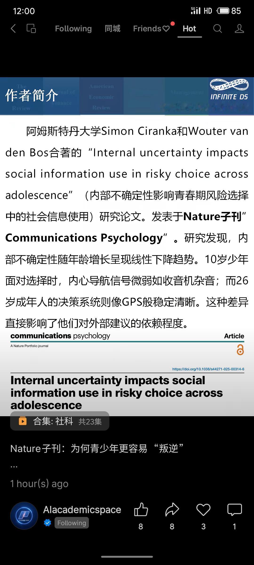 该研究通过贝叶斯建模揭示,青少年更高的社会影响敏感性源于其内部决策不确定性,随年龄增长而降低。这挑战了“青少年天生偏好风险”的传统观点,强调其依赖社会信息以弥补经验不足。研究为理解青春期风险决策提供了新机制视角,并指出通过积极引导与确定性反馈促进健康决策的干预可能。