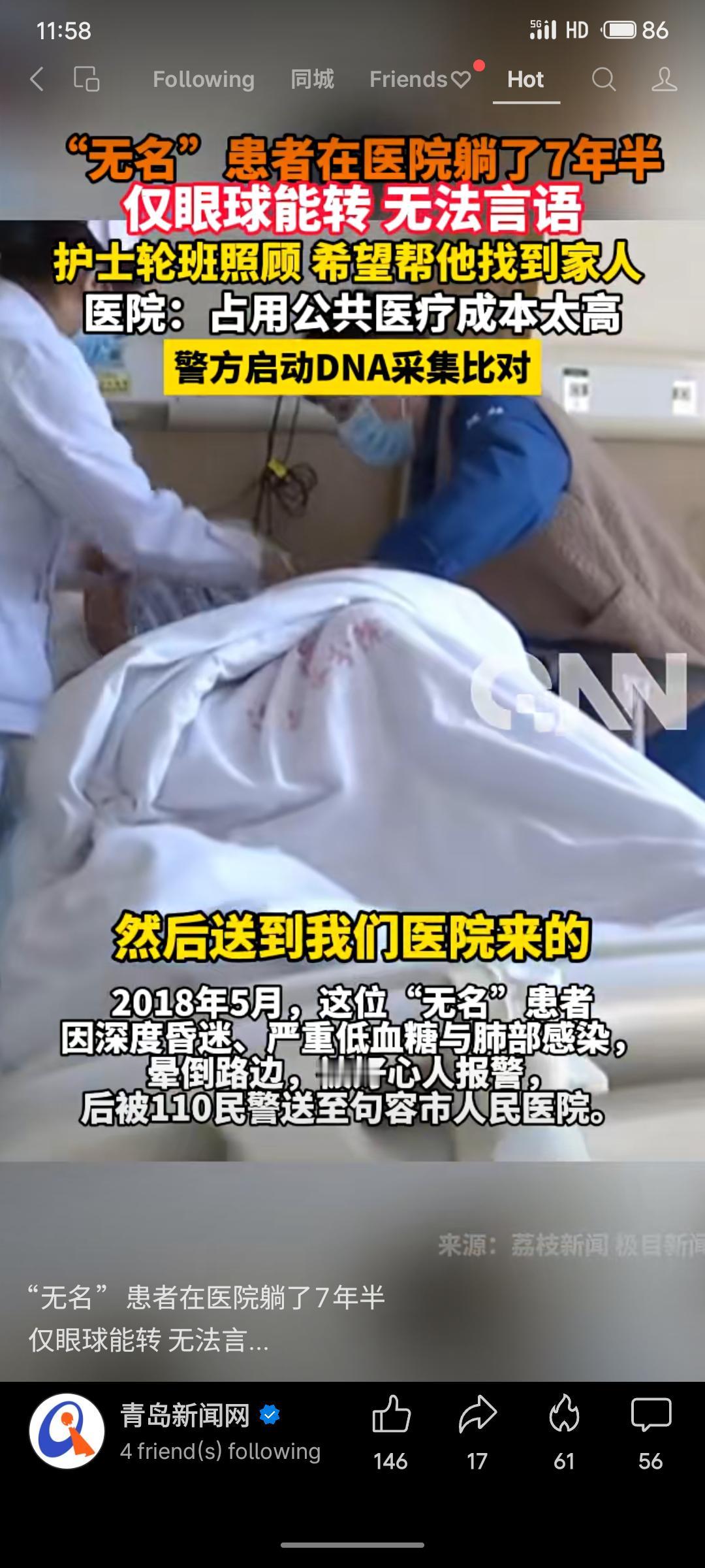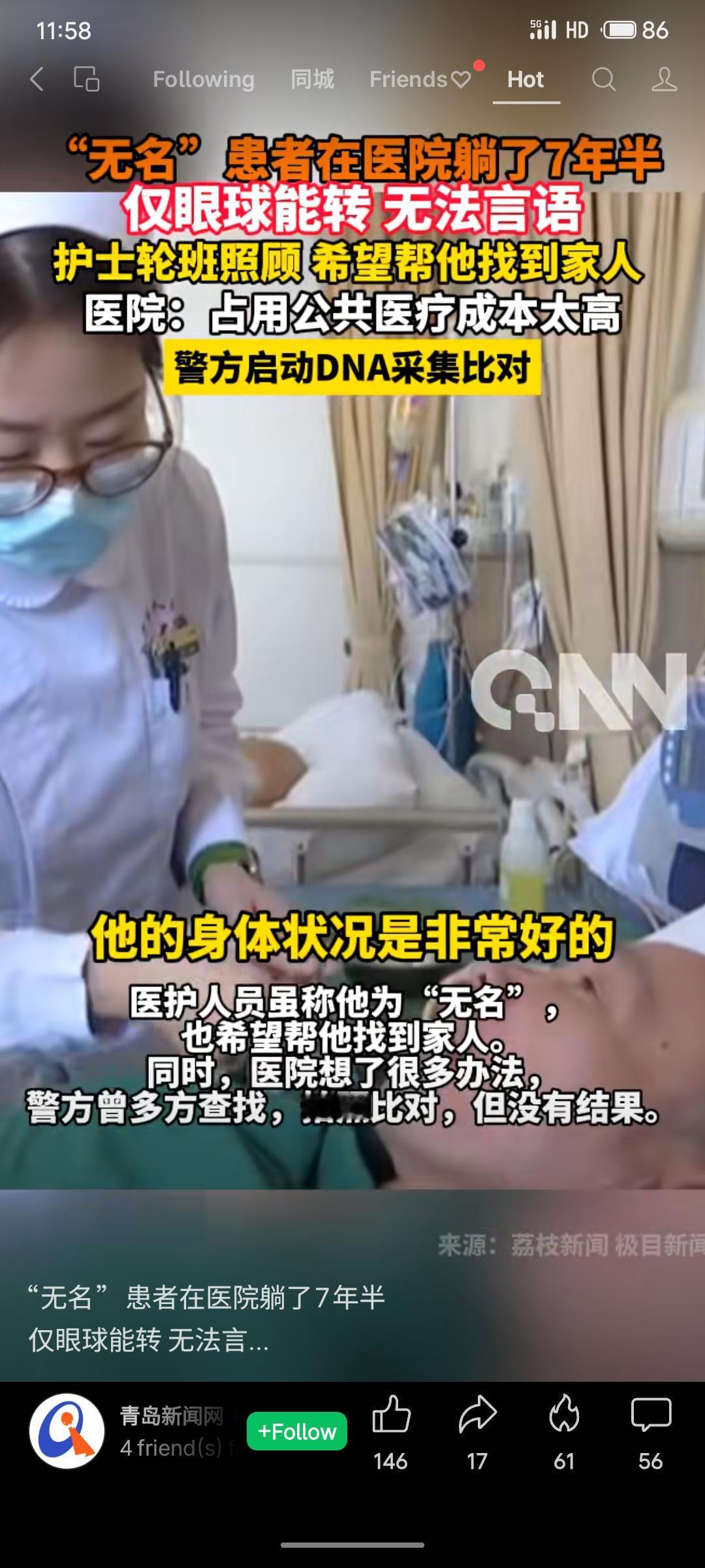 江苏句容一“无名”患者因深度昏迷入院,七年半来仅能转动眼球,无法言语。医护人员轮班精心护理,使其身体状况平稳,未发生褥疮。医院希望帮其寻亲,但多方查找未果,警方已启动DNA比对。此事既彰显了医疗系统的人道坚守,也凸显了无名患者身份识别与社会救助机制面临的现实困境。