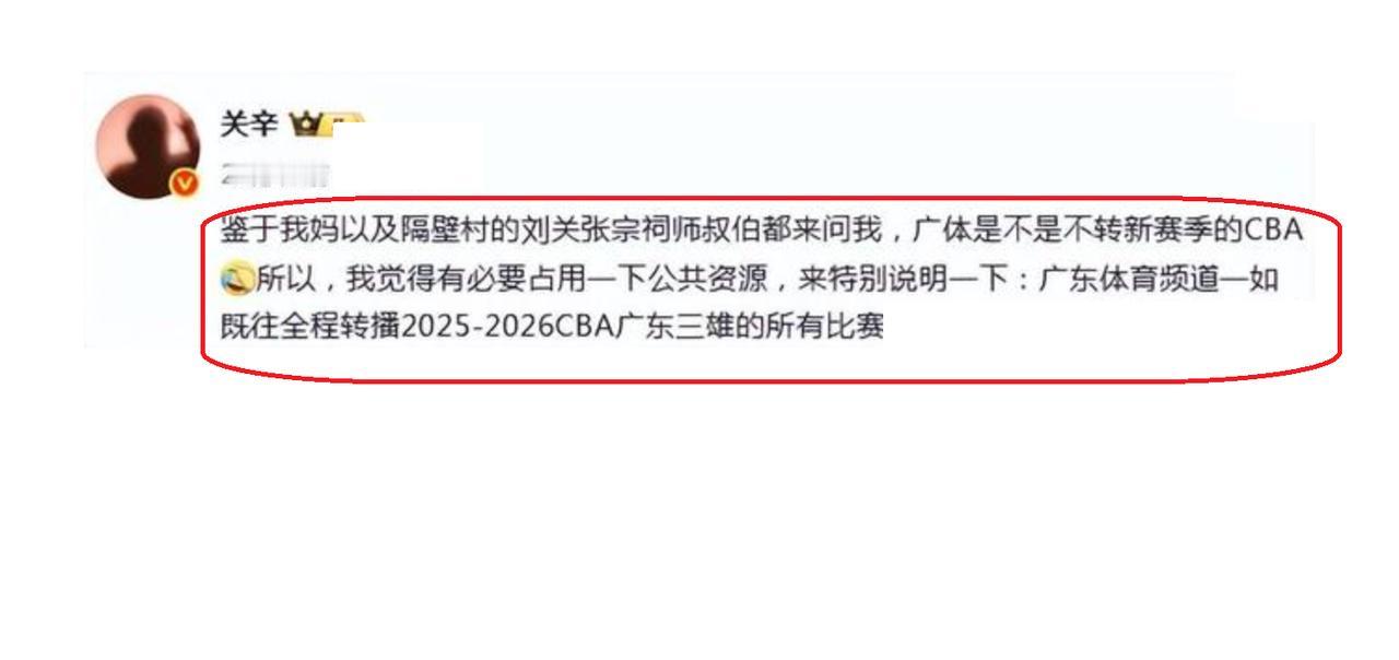 广东球迷真的很幸福! 随着CBA新赛季的比赛马上开打,然而,却有一件事让球迷感到十分疑惑,没错,那就是至今,CBA比赛的直播方还没有确定。虽然,央视也会对CBA比赛进行直播,但是,根据了解,央视每天只会播一场比赛,而且,央视频和电视直播的比赛,也是同一场比赛。如此一来,很多比赛就没有直播,就像有球迷表示,想要看CBA的比赛,就只能到场馆去看了。 至于为何会出现这样的问题,主要是CBA公司与转播方的价格没有谈好。上一个五年,咪咕购买了CBA比赛直播版权,当年为20亿五年,也就是说每年4亿,同时,这还不是独家版权,可以说咪咕这个价码已经是天价了。很多直播平台因为价格太贵,也是直接退出了直播。 然而,五年过去了,咪咕并没有直播CBA比赛赚钱,反而是亏了不少钱。因此,对于下一个五年合同,咪咕就直接砍价了,在刚开始,咪咕开出了5年7亿的价格,但是,很快就被CBA公司拒绝了。后来,双方继续谈判,咪咕也是提升了价格,提到了5年10亿,然而,这样的价格,依然没有得到CBA公司的同意,就这样,双方的谈判已经陷入了僵局状态。 根据了解,目前,双方依然没有达成协议!而且,也没有其他体育平台比咪咕提供更高的价格,就这样,CBA常规赛马上开打,却没有直播商接手,让联赛陷入了无直播的状态,只能是文字直播了! 值得一提的是,广东球迷并不用为没有CBA直播而感到苦恼,因为,广东体育会对广州队、深圳队、广东队的比赛进行全程直播。 根据广东队随队记者关辛透露,广东体育频道将会一如既往,全程直播CBA2025-2026赛季,广东三雄的所有比赛!(广东队、深圳队、广州队) 毫无疑问,虽然CBA比赛直播还没有确定,但是,至少广东球迷并不会因为没有比赛直播而感到苦恼,显然,这对于广东球迷也是一种幸福之事。