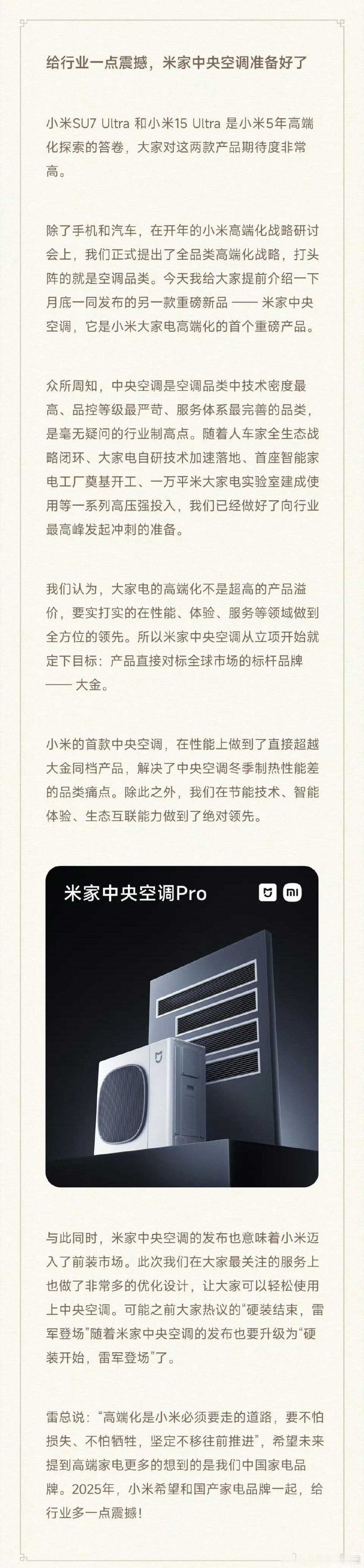 卢伟冰宣布小米将发布自产中央空调卢伟冰正式官宣了,小米要出自己产的中央空调了,一上来就敢碰行业里最难的这块硬骨头,实力是真够顶的。现在小米手里握着手机、汽车、大家电三座工厂,还是全球独一份能同时搞定这三大品类产研一体的品牌,锐锐都感觉很自豪。其实小米本身就是国家级智能制造标杆,6.5秒就能下线一台空调。工厂还搬来了手机和汽车工厂的先进技术,制造公差能精准到±0.05mm,关键零部件更是100% AI质检,抓品质这块小米一向让人安心。而且不管是家用空调还是新出的中央空调,全都是十年包修,这大概就是有自建工厂的底气。从最难的中央空调开始自研自产,也足以看出小米的野心。期待小米这次能再给行业来波全新的改变!