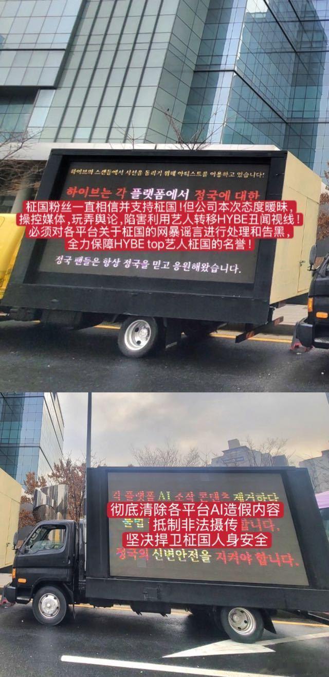 田柾国粉丝卡车应援田柾国粉丝Hybe楼下卡车维权,公司好像没有明确回应诶...