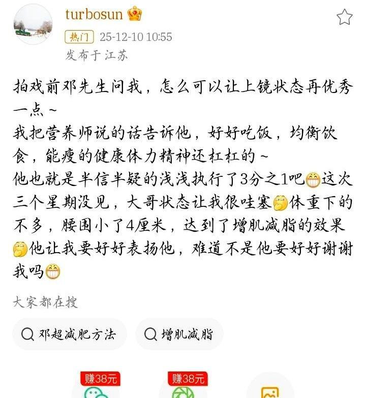 邓超被孙俪“收拾”了21天,腰围直接掉4厘米。 别信什么明星有私人教练——真正的高手是你老婆。 孙俪那套养生法,早把邓超从一天啃20个鸡蛋的增肌猛男,调成了穿衣显瘦的衣架子。 三周前她开始盯他: 早上6点半拍“八虚”,逼经络动起来; 早餐三黑粥打底,黑豆黑米黑芝麻磨成糊; 晚饭砍掉所有精制碳水,换成她调的五行蔬菜汤。 最狠的是“夫妻同步律”: 孙俪喝什么,邓超碗里就是什么; 孙俪几点睡,邓超手机准时上交。 专家数据摆在那儿——伴侣一起健康管理,成功率飙高60%。 黄磊孙莉在健身房挥汗,陆毅鲍蕾执行168断食,本质都是同一套底层逻辑:用亲密关系绑定生理纪律。 昨天邓超晒腰带新扣眼时咧嘴笑:“我老婆说我再不听话,下次就改喝苦瓜汁了。 ” 婚姻最好的状态,不是谁管着谁,而是你的健康刻度里,永远有我的影子。