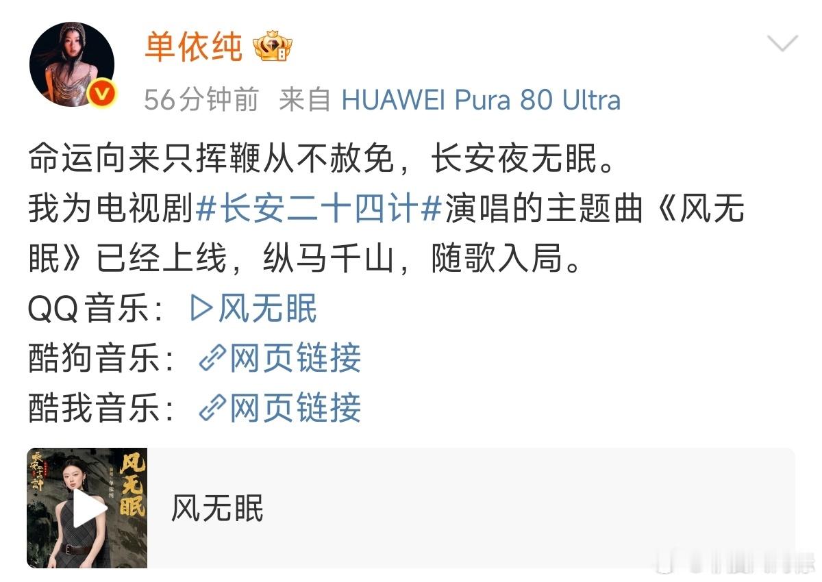 单依纯唱长安二十四计主题曲单依纯演唱长安二十四计主题曲风无眠单依纯《长安二十四计》演唱的主题曲《风无眠》已经上线