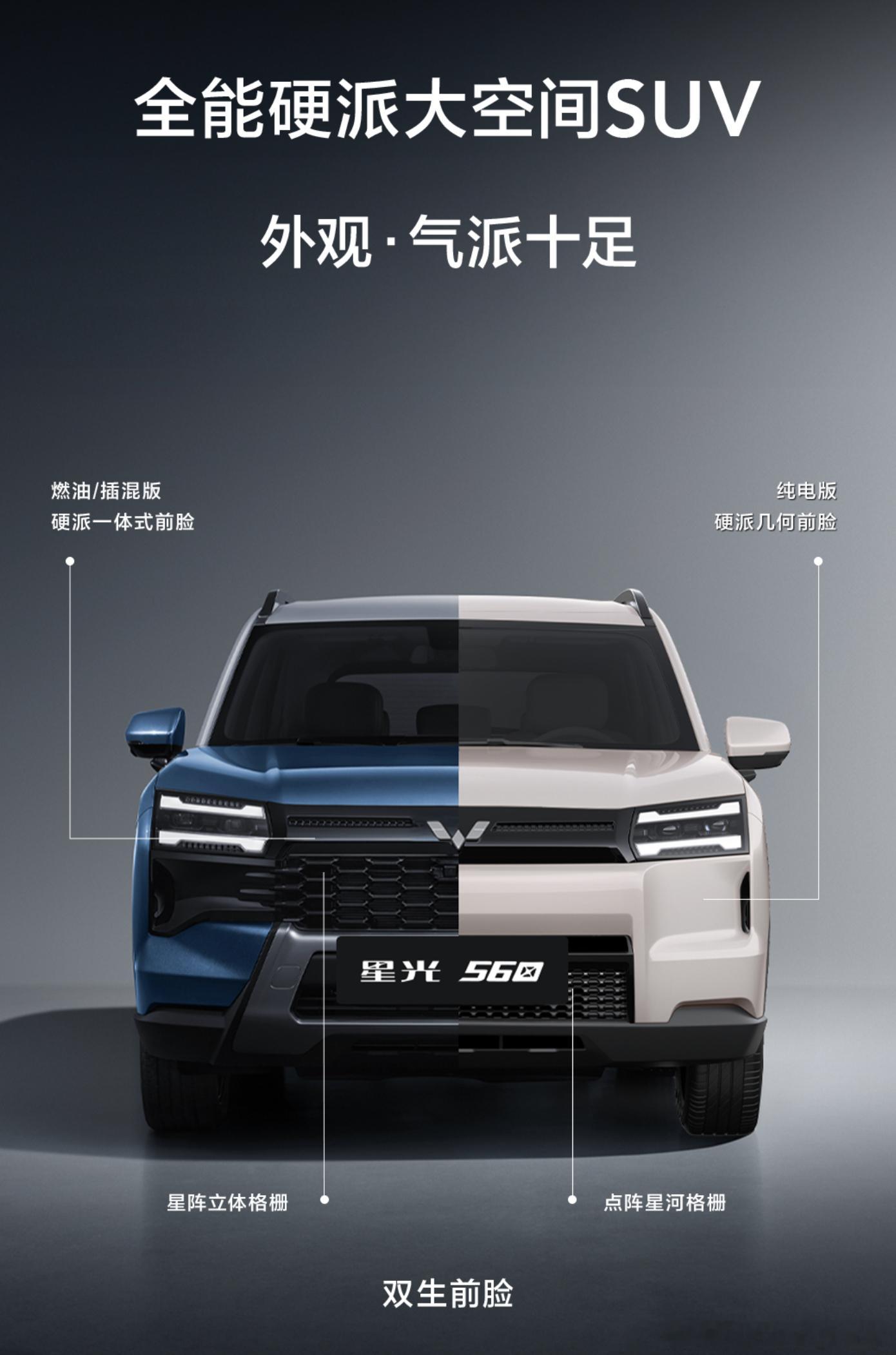 五菱星光560来了,总结下亮点:新车定位“全能硬派⼤空间SUV”,售价5.98万起星光560采用了硬派越野的造型,尺寸上,新车车长4745mm,轴距2810mm,并一口气提供了燃油、纯电、插混三种动力形式可选动力方面,燃油版搭载1.5T发动机,最大功率130kW,匹配6MT或CVT变速箱;插混版采用1.5L自然吸气发动机与电机组合,配备20.5度磷酸铁锂电池,纯电续航100km,综合续航可达1100km;纯电版则搭载最大功率100kW的电机,CLTC续航里程为500km,并支持2C快充在智能化配置上,新车支持HiCar、CarLink及DLNA等多系统手机互联功能硬派大空间星光560首发权益价59800起