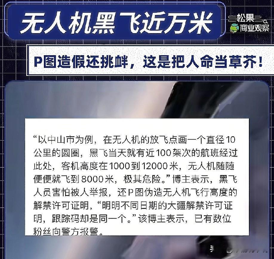 必须严查!无人机黑飞,险与民航客机相撞!李子雄斥责:简直是挑战航空安全底线!甚至敢伪造解禁许可!警方已介入调查! 黑飞者竟然把无人机飞到8000米高空,要知道短途客机航线(如国内航班):多在6000-9600米。,长途航线(如洲际航班):通常在8000-12600米。就算是一只鸟撞上飞机都可能引发坠机事故,黑飞者把无人机飞到这个高度无疑是置机上乘客的安全于不顾,是公然挑战航空安全的底线!说严重点,如果无人机上装了攻击性武器甚至炸弹呢?真是不敢想! 目前广东多地警方已经介入调查,这个事情一定要严查,每架飞机上都关系着几百个家庭,航空安全的底线不容挑衅!