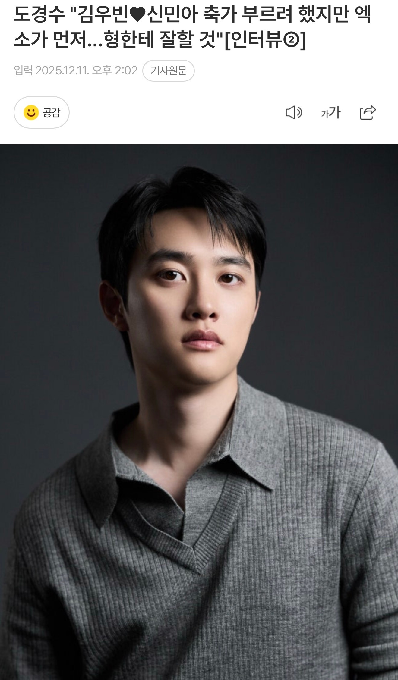 哎古,都暻秀本来都想好要在金宇彬申敏儿婚礼上唱popcorn了🥺都暻秀采访:(缺席)是理所当然的。因为是工作,肯定是工作重要,反而我认为EXO是第一位的。(缺席婚礼)虽然我心里非常难过,但我必须好好对待宇彬哥。哥当然也知道这是没办法的事,虽然有遗憾,但这都完全可以理解,所以没关系。我正在苦恼这之后该怎么做,该用什么来补偿宇彬哥。我其实很苦恼。我本来理所当然地以为祝歌该由我来唱。我很早就知道哥要结婚的消息。之后因为要参加‘MMA’,所以苦恼该怎么跟宇彬哥说,不是该怎么说,而是必须说。我们俩都觉得很可惜。本来打算唱《popcorn》作为祝歌的。不知道谁会来唱祝歌了,我已经从宇彬哥的考虑范围内被排除了(笑)