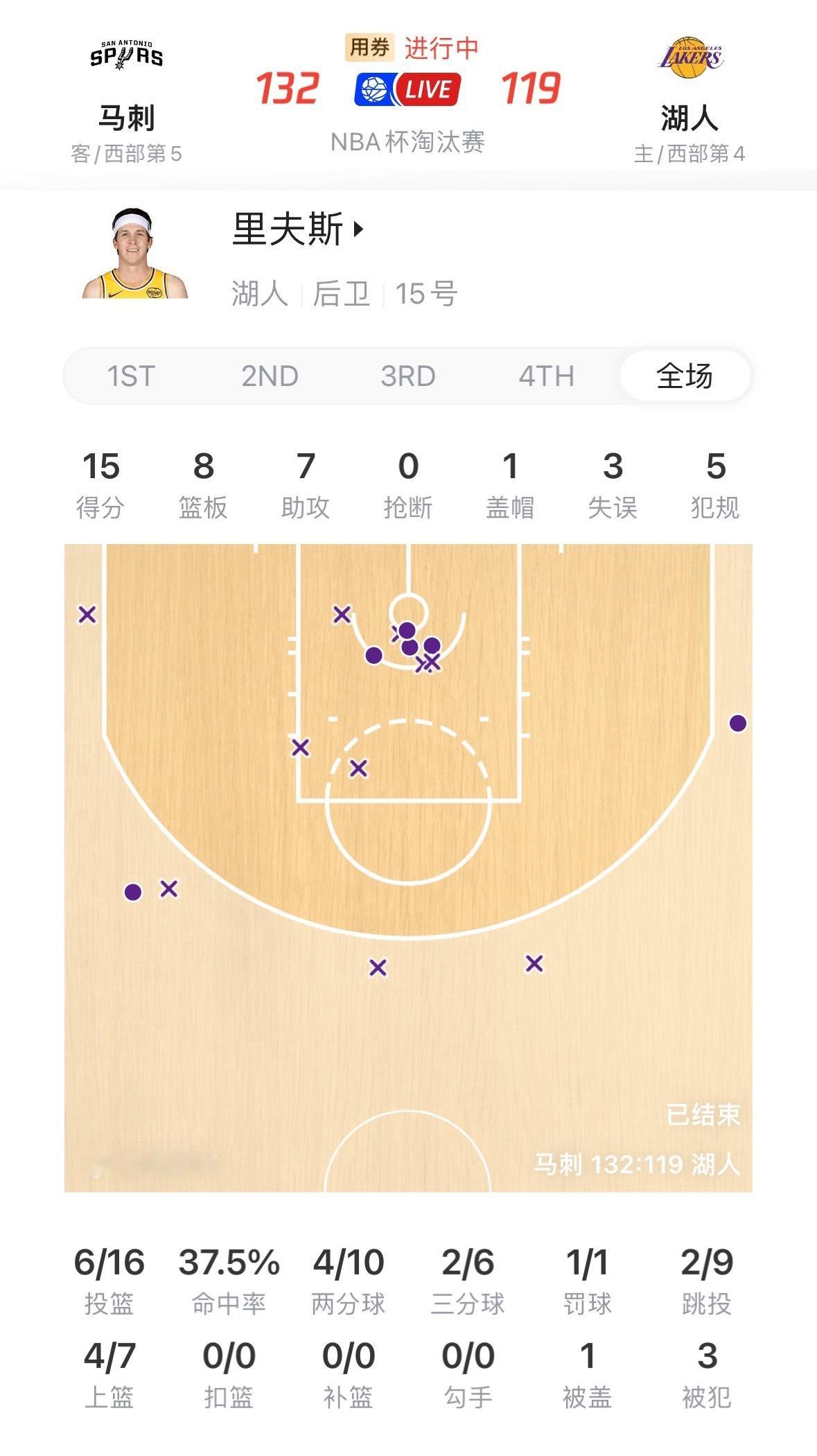 状态不佳,里皇打铁。里夫斯40分钟15分8板7助攻,投篮命中率37.5%。