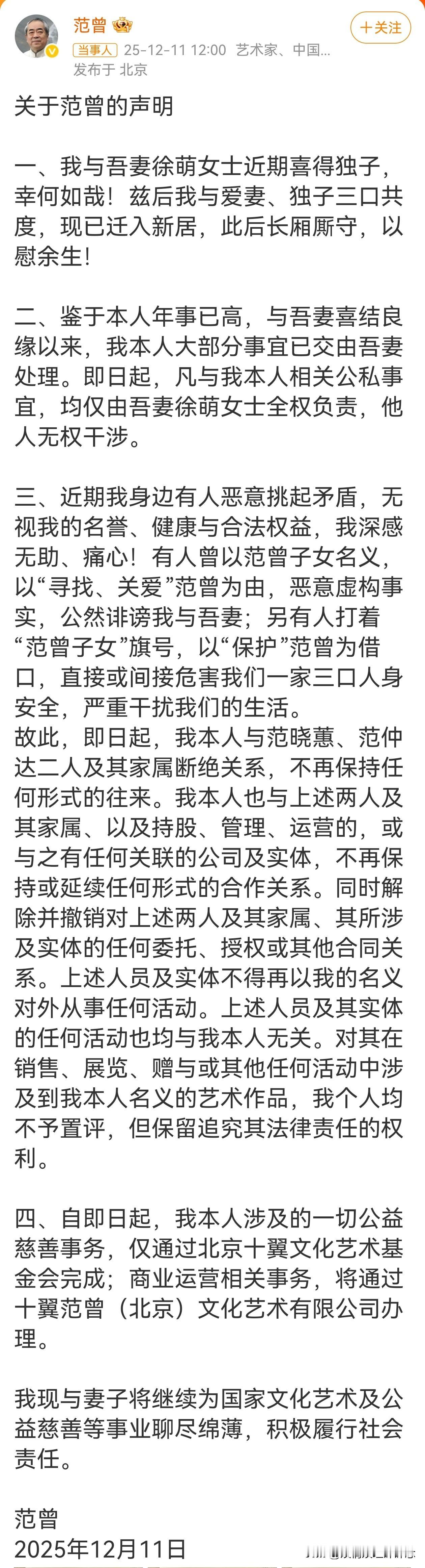 短剧都编不出的故事, 87岁的书画家范曾和相差50岁的妻子徐萌,喜得独子,还特意发了个声明,说了三点: 第一,生了个儿子太高兴了,一家三口准备搬新家,剩下的日子就在新家里过了。 第二,由于自己年龄大了,所以把所有相关事务都交给老婆徐萌,其他人不要来干涉。 第三,最近身边恶人挑事,威胁到一家三口的人身安全,所以要和亲生女儿还有继子及其家属断绝关系,不再往来。 我特意查了下,范曾这个老艺术家,一共结了四次婚,他要断绝关系的女儿范晓蕙是他的第二任妻子所生,继子范仲达是他第三任妻子与前夫所生,现在,他与现任妻子又生了个儿子,直接把亲生女儿和继子踢出局了。 网友调侃:“等亲子鉴定出来再发声明也不迟。” “说到底还是徐萌厉害,数十亿家产继承格局大洗牌,这剧情也太癫了。” 不过,像这样发声明断绝关系,以后女儿继子还有继承权吗? 徐萌和范曾