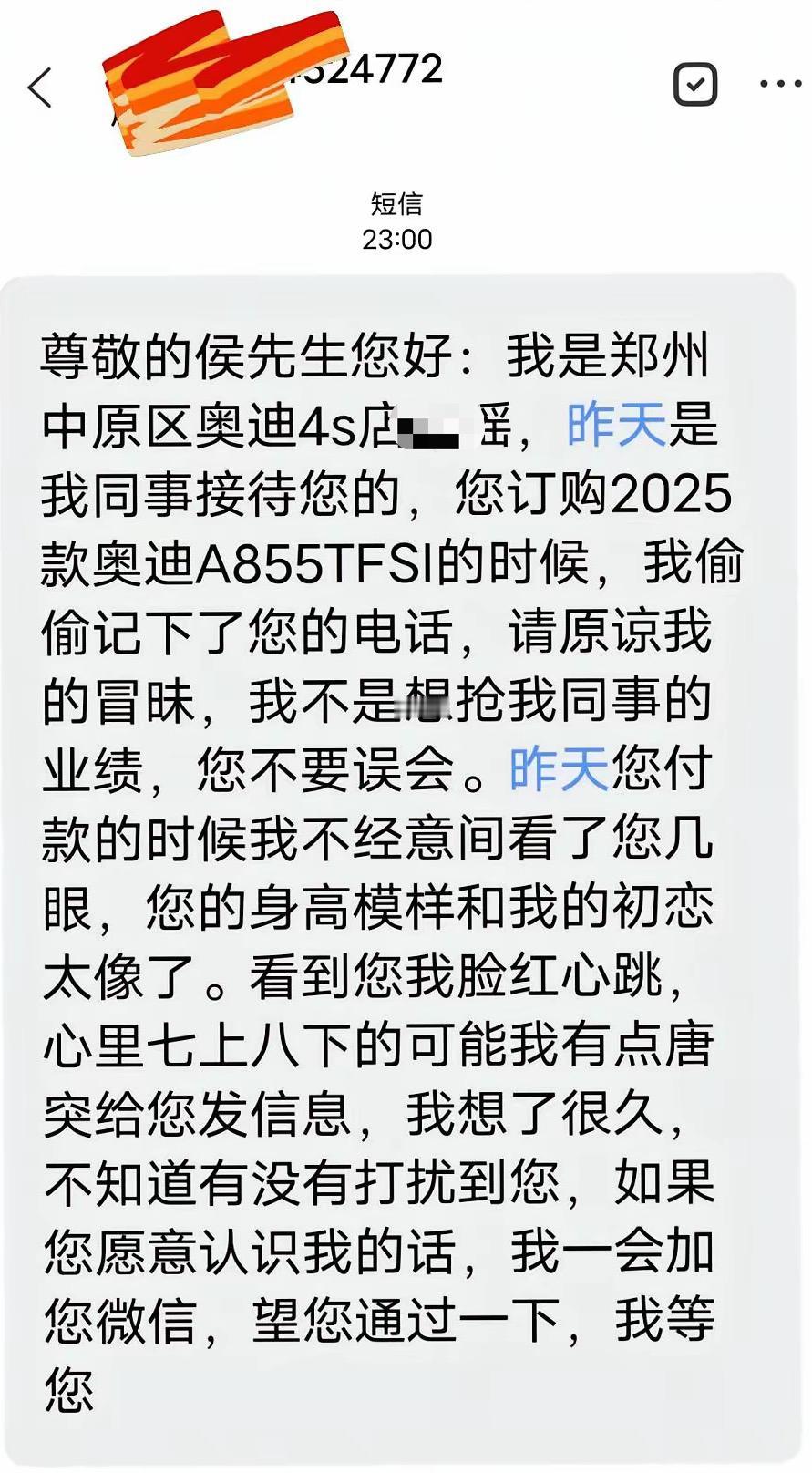 奥迪的销售顾问,给客户发暧昧信息,这能是真的吗? 如果是真的,奥迪品牌的脸面何在,卖车就靠美女出卖色相?这家店的脸面何在?我们开的还是卖车的店吗?至于这位销售顾问,我们就不过多评论了。 如果是假的,这个图片是什么人发出来的?目的是什么?是为了造谣抹黑汽车销售人员,还是为了抹黑奥迪这个品牌呢? 您就像我的初恋,让我脸红心跳,这句话,太有意境了,有趣的灵魂,还真的是万里挑一。