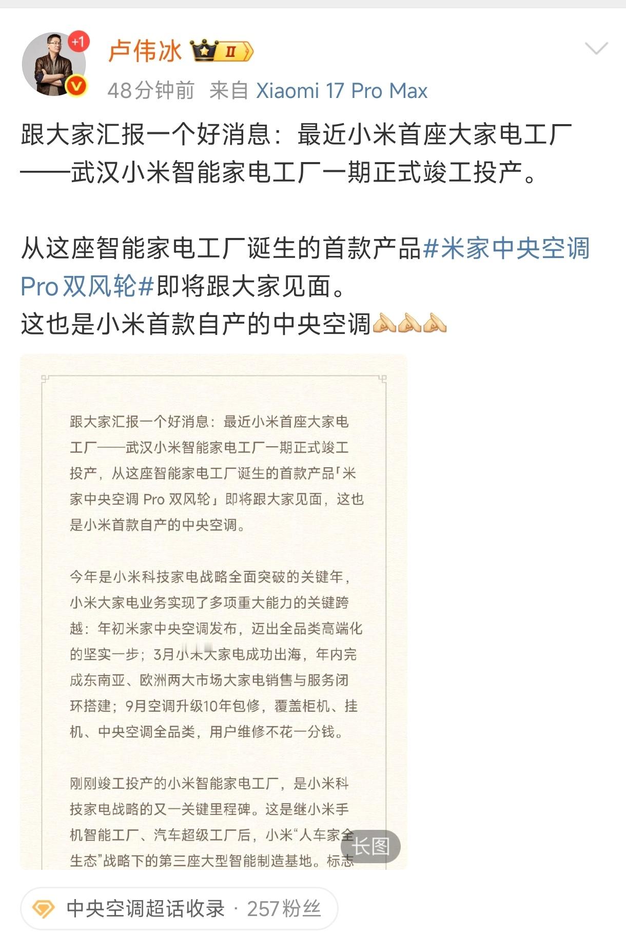 卢伟冰宣布小米将发布自产中央空调 今年小米的大家电业务可谓是突破式发展,先是在东南亚和欧洲完成了出海,实现了销售和服务闭环;随即在9月,小米官宣了全系空调10年包修;紧接着就是10月,小米位于武汉的智能家电工厂竣工并投产。目前小米坐拥手机、汽车、家电三座超级工厂,实现了家电业务乃至“人车家”自研、自产、自销的闭环,能够在智能制造领域达到这一步的,业内有且仅有小米一家。今年小米发布了大6匹的米家中央空调 Pro,上市近半年来大受好评,除了传统的价格优势和智能优势之外,小米甚至提供了各小区户型的查询服务,以实现用户测初步的可视化,这样好让消费者心里有个底。不过这个空调也存在一些局限性,就是大6匹最大推荐覆盖面积是130㎡,这对于很多住170㎡以上大平层乃至别墅的用户来说自然是不够的。因此在这个需求下,小米也即将发布双风轮版本的米家中央空调 Pro,最大能支持到8匹,这对于大户型用户来说是一个非常不错的选择。并且这个空调也是由小米武汉家电工厂生产,从收到需求到产品落地不过一年,有了工厂之后,小米的反应速度是真的快!在小米提出人车家之后,业内多家友商快速跟进,并且都取得了不错的成绩,从去年开始,小米大家电高速增长已经证明了在人车家生态模式下,科技家电是不可缺少的一环和重要发展方向,自建工厂就是明确all in的信号了。