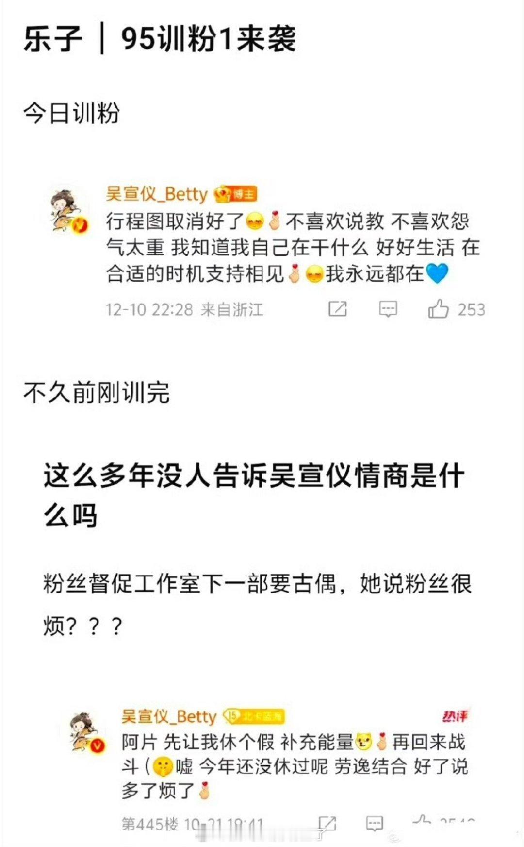 吴宣仪 训粉提到吴宣仪这姐,那真是说都说不完,之前还说把微博给公司,也叫粉丝少管她,现在又来这一套