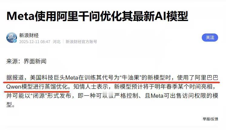 当硅谷开始主动“学习”中国的开源代码,这意味着什么? 彭博社12月10日的报道揭示了一个里程碑式转折:Meta秘密研发的新模型“牛油果”,正在蒸馏来自中国阿里的千问Qwen开源模型。扎克伯格的这一选择,与数月前他“支持美国模型”的公开表态形成了微妙对比。 市场反应最真实——消息一出,阿里巴巴盘前股价应声上涨超4%,而meta跌了1%。 这并非偶然。黄仁勋数周前就直言:“中国在开源领域遥遥领先。”数据佐证了这一点:千问Qwen不仅在多项评测中性能全球领先,更在2024年8月衍生模型数超越Llama,2025年10月下载量也完成反超,正式登顶全球开源模型榜首。 开源领域的权杖交接,折射出更深层的变革:中国模型已从“学习者”转变为“被学习”的对象。当全球最大的社交平台开始将中国代码融入核心研发,这已经超越了技术合作,成为产业地位变迁的清晰注脚。 与此同时,千问在C端市场正以惊人速度验证其实用价值:APP上线23天月活突破3000万,四大核心功能坚持免费开放。从实验室的技术指标到千万用户的真实使用,中国AI正在完成从技术突破到生态构建的完整闭环。 值得玩味的是,这种“墙内开花墙外香”的现象——国际巨头研究其开源代码,国内用户享受其免费应用——勾勒出中国科技企业在新阶段的独特路径:既保持开源开放的技术胸怀,又打造普惠大众的产品体验。 这或许预示着一个新时代的开启:在AI这场定义未来的竞赛中,评判标准正从“谁的技术更先进”转向“谁的生态更繁荣”。当全球开发者基于中国模型构建创新,当国际巨头主动融入中国技术栈,创新的源头正在悄然位移。 扎克伯格的选择,或许只是这个宏大叙事中的第一个脚印。
