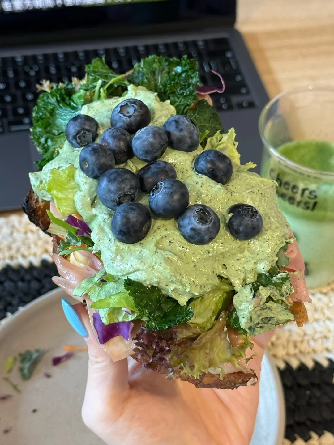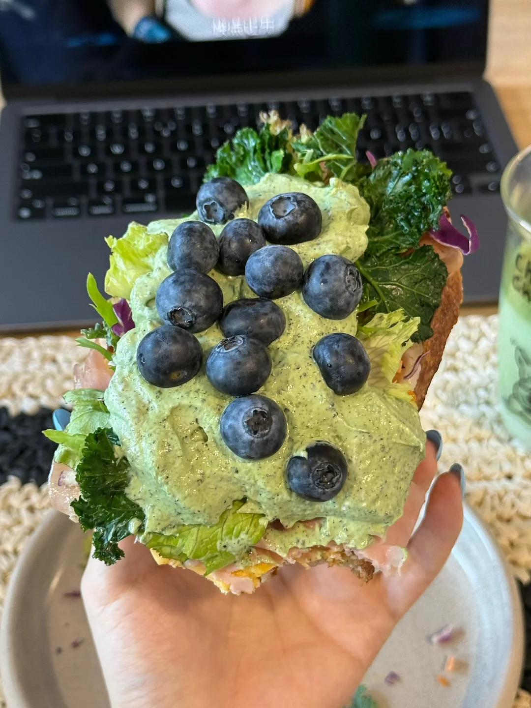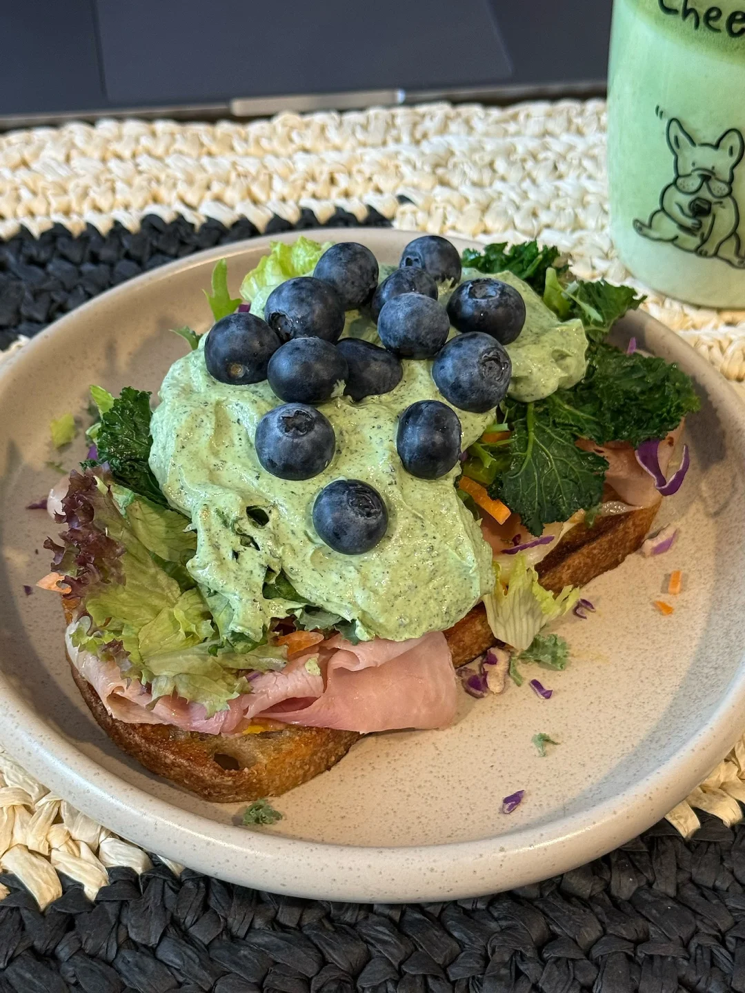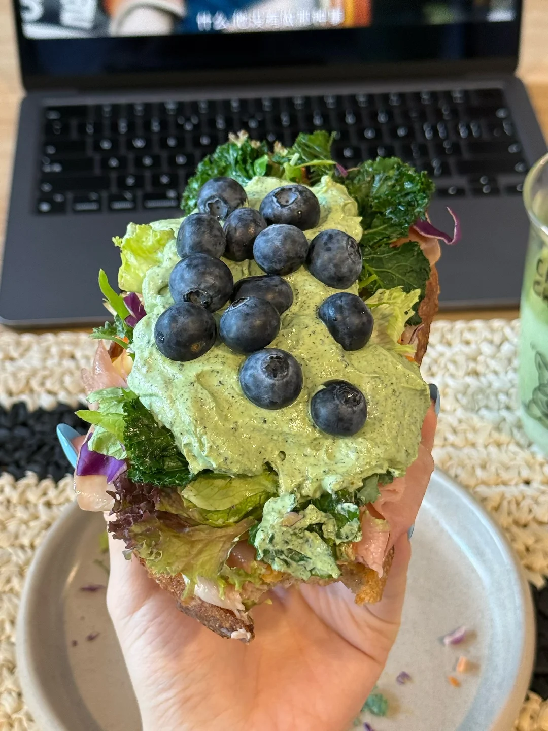 📍佛系养生D25 初始:56.6kg 今早:54kg 3分练7分都得靠吃!吃好才美好! 【早餐】 🍞纯鲁邦乡村,亚麻籽油直接淋到面包上煎烤,就能得到一块又香又脆的乡村欧包! 🍳黑胡椒盐滑蛋,打好蛋下锅,随意滑动,直到只剩一点液体就关火! 🧀芝士片趁热放在滑蛋上会很香 🥓意式传统熟火腿,放进热锅用余温煎一下好吃极了~ 🥗混合蔬菜,只把羽衣甘蓝热了一下,其他都是生菜 🥛抹茶黑芝麻酸奶酱,最爱酸奶酱没有之一 🫐冻蓝莓,早上多补充浆果类食物,教练都说我会吃 🍵抹茶杏仁饮