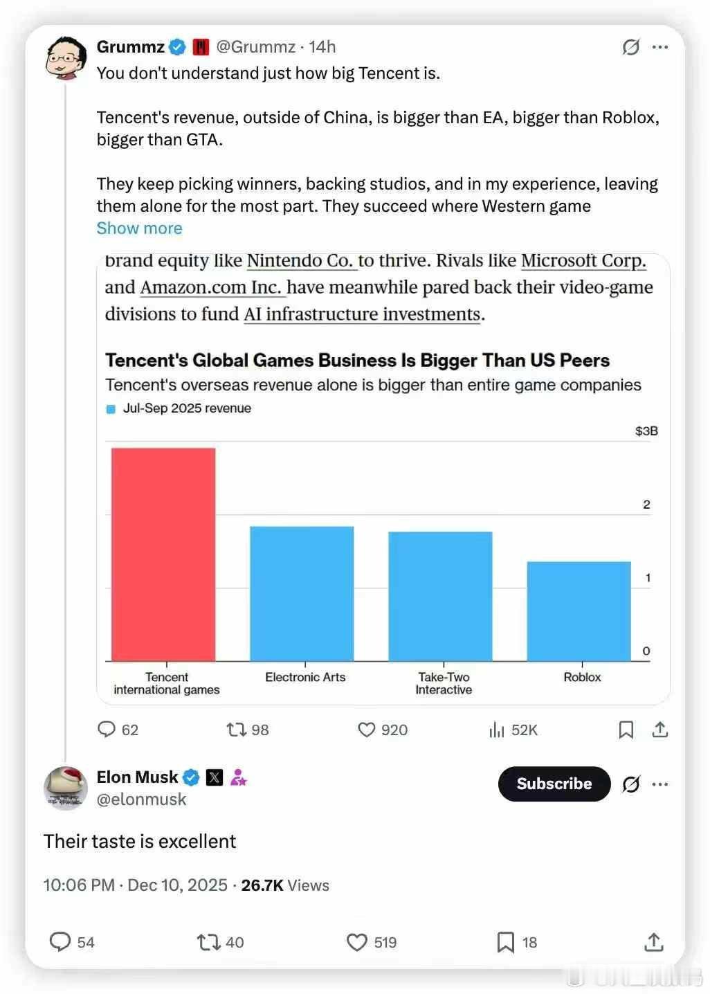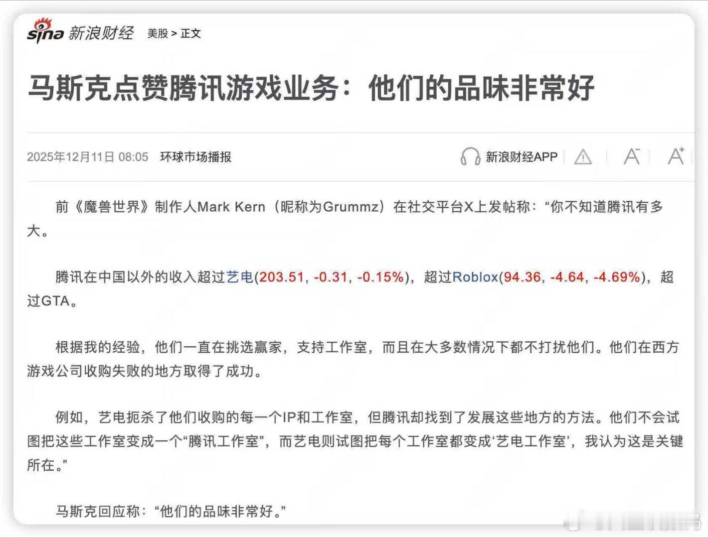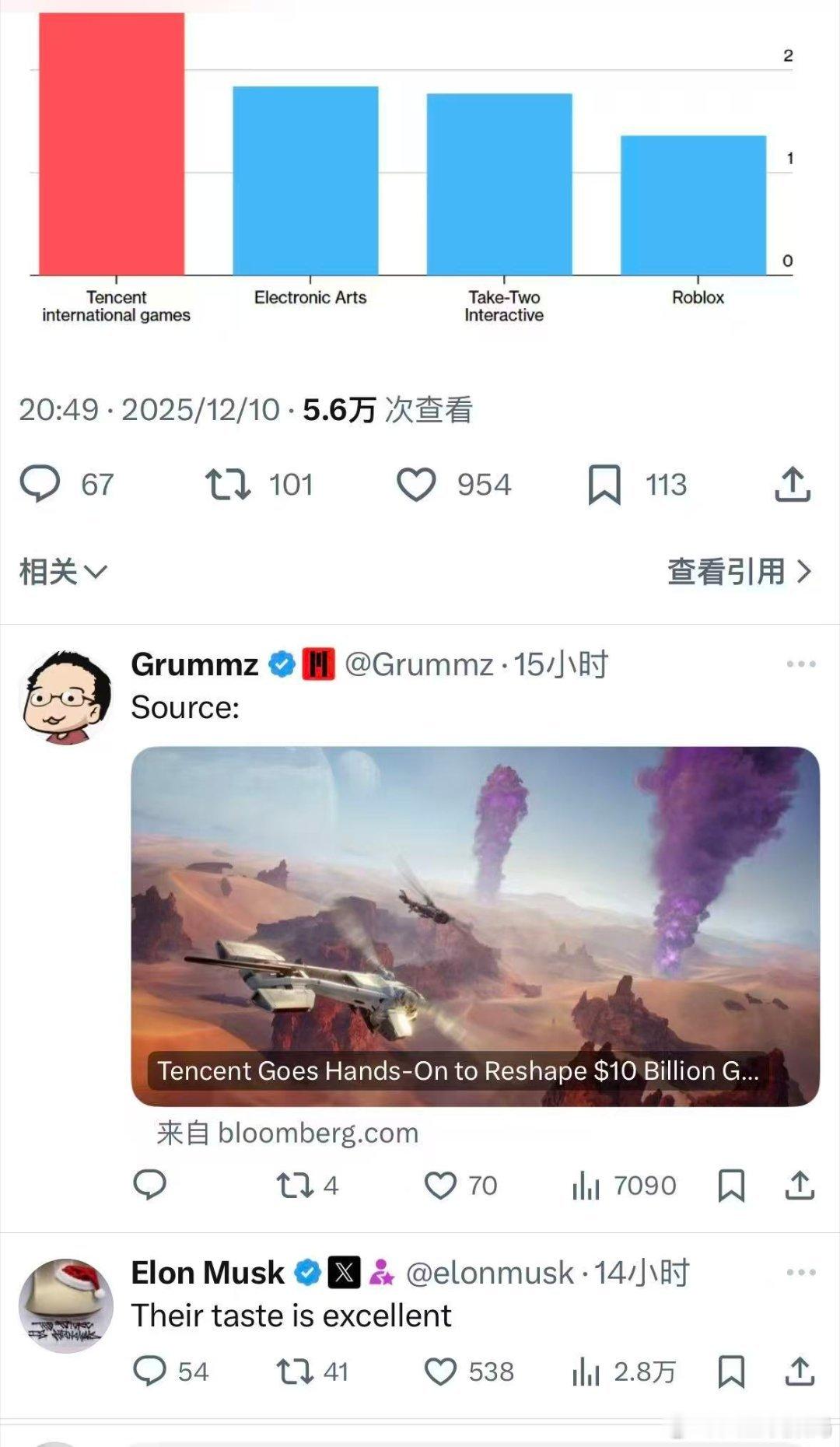 【马斯克赞腾讯游戏:他们的品味非常好】马斯克的一天曝光 前《魔兽世界》制作人 Mark Kern(昵称 Grummz)近日在社交平台 X 上分享了对腾讯的观察。他指出:“很多人并不真正了解腾讯的规模。仅在中国市场以外,腾讯的收入就已超过艺电(EA)、Roblox 甚至《GTA》系列的表现。” Kern根据自身经验补充道:“腾讯善于挑选有潜力的赢家,投资工作室,并且大多给予其充足的自主空间。他们在西方游戏公司屡屡受挫的收购领域取得了显著成功。例如,EA扼杀了他们收购的每一个IP和工作室,但腾讯却找到了发展这些地方的方法。他们不会试图把这些工作室变成一个“腾讯工作室”,而EA则试图把每个工作室都变成‘EA工作室’,我认为这是关键所在。”该观点得到了马斯克的回应,他评论道:“他们的品味非常好。”(快科技)