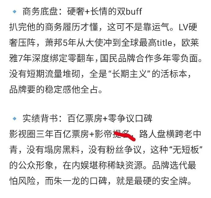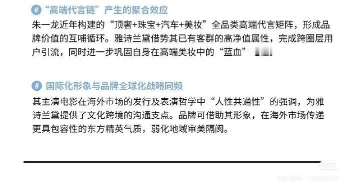 雅诗兰黛这么分析朱一龙星光的:顶级硬奢长代矩阵+品牌与品牌、电影互哺+粉丝稳定性+无冲突气质+老中青破圈认知度+全球叙事。确实是内娱稀缺资源不愧是专业的分析,难怪朱一龙一直代言都这么顶级权威雅诗兰黛对朱一龙也是给相当顶级的待遇,给了最权威最赚钱的线,首次给男士全球抬头,地广已铺