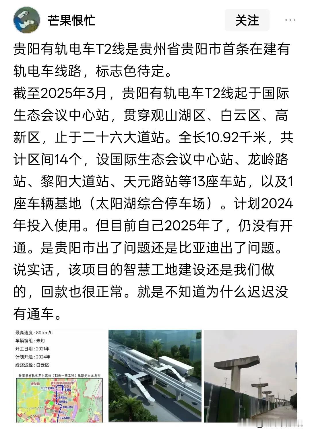 贵阳首条云巴线路——有轨电车t2线在今年8月已经实现轨通,到年底了却没有进一步的开通讯息传出。大家以为在今年底能够通车运营,然而目前已经进入12月中旬,还没有得到当地交委的确切通知。已经经历过多次运营日期跳票的贵阳有轨电车t2线路到底什么时候开通?目测线路开通时间只能继续顺延下去。 综合各个互联网平台的消息,目前贵阳有轨电车t2线路已经完成轨通(即完成轨道铺轨)。说起来贵阳有轨电车t2线路也是命途多舛。早在2020年之前,贵阳有轨电车t2线路的前身即贵阳云巴线就已确立。到2021年底正式开工建设,期间因外部因素影响有过断断续续的停工,复工。2024年的时候,线路土建设施和车站施工已经进入收尾工作,虽然又延宕至今年才实现轨通,但好在线路已经完工了。好消息是,除了定名为贵阳有轨电车T2线以外,原来的云巴制式、高架线路、独立路权、沿线设置等仍然不变。贵阳有轨电车将以“高架专轨”的方式服务站点居民,大家再也不用担心在红绿灯中拥堵和高峰车流造成车次延误了。只待有关方面公布具体运营日期!