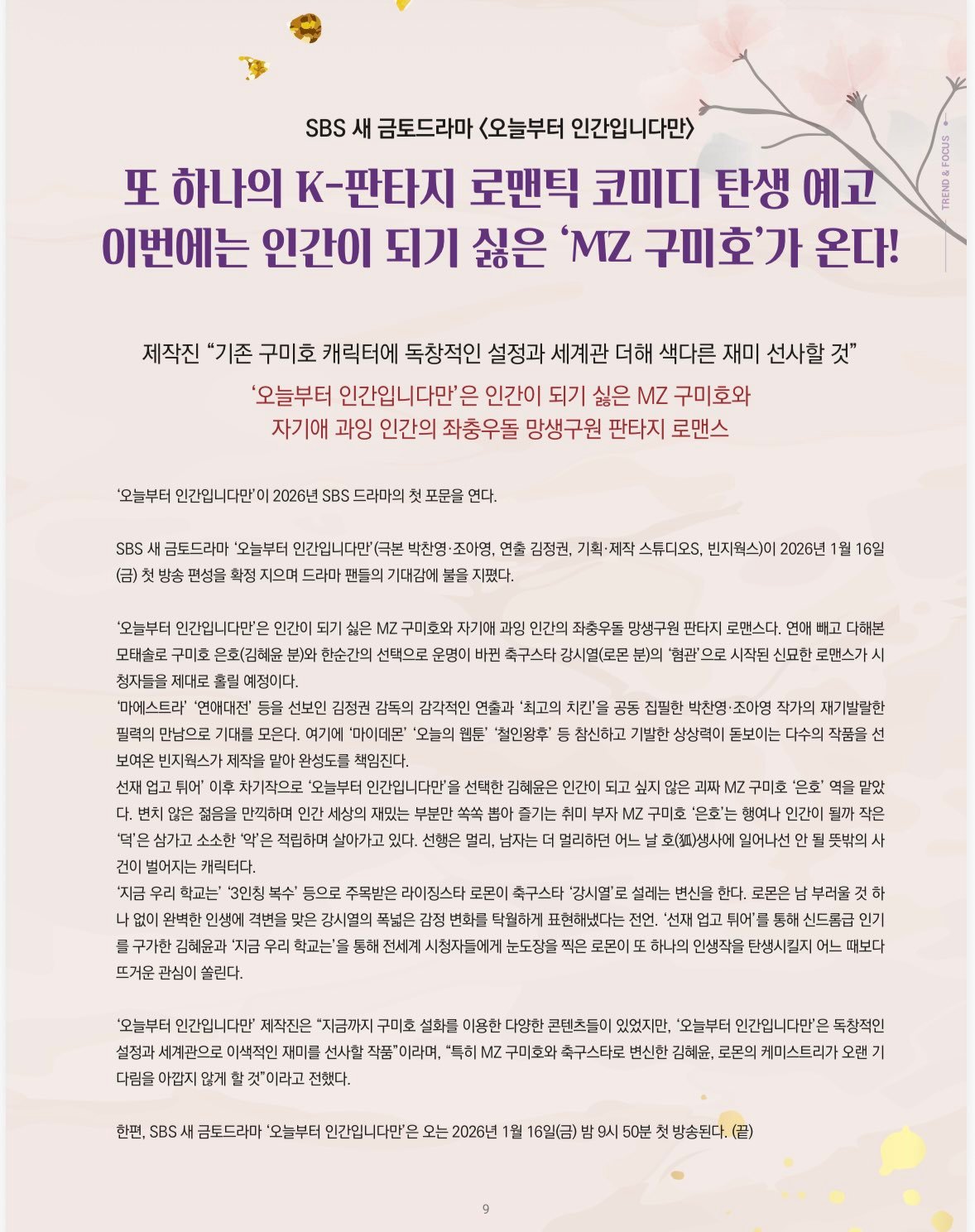 金惠奫X 朴所罗门 《虽然今天开始就是人类》引言SBS全新金土电视剧 《虽然今天开始就是人类》又一部K-奇幻浪漫喜剧诞生预告这次将迎来不想变成人类的“MZ九尾狐”!《虽然从今天开始是人类》是一部讲述不想变成人类的MZ九尾狐与自恋过剩的人类之间横冲直撞的拯救亡生的幻想罗曼史。继《背着善宰跑》之后,选择《虽然今天开始就是人类》作为下一部作品的金惠奫,将饰演不想变成人类的古怪MZ九尾狐“恩浩”。享受不变青春、只挑拣人间有趣部分享受的MZ九尾狐“恩浩”,生怕变成人类而谨小慎“德”、积攒微不足道的“恶”而活。这是一个远离善行、更远离男人的角色,却在某天狐生中发生了不该发生的意外事件。新星朴所罗门将变身为令人心动的足球明星“姜时烈”。据悉朴所罗门出色地演绎了人生完美无缺却遭遇剧变的姜时烈广泛的情感变化。凭借《背着善宰跑》掀起热潮的金惠奫,和通过《现在我们学校》给全球观众留下深刻印象的朴所罗门,能否诞生又一部人生作品,吸引了比以往任何时候都更热烈的关注。制作团队表示:虽然迄今为止有不少利用九尾狐传说的多样内容,但《从今天开始是人类》将凭借独创的设定和世界观,带来别样的趣味。特别是MZ九尾狐和变身为足球明星的金惠奫、朴所罗门之间的化学反应,将不辜负大家长久的等待。