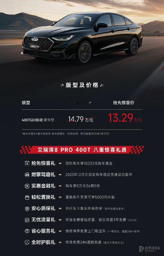 奇瑞艾瑞泽8 PRO又上新了!新增400TGDI DCT豪华型,官方指导价14.79万,限时优惠价13.29万就能拿下![666] 动力:2.0T发动机最大功率192kW(261马力),峰值扭矩400牛·米! 空间:车长增加12mm至4812mm,轴距2790mm,紧凑型身材,B级车空间体验。 配置:Lion雄狮系统(8155芯片)、L2级辅助驾驶、SONY音响等,与现款390TGDI豪华型基本一致。 销量:艾瑞泽8系列月销稳态1.3万辆,1-11月累计超13万辆,实力不俗。 13万出头,买台2.0T“性能小钢炮”家用,你觉得香不香?还是会选择更稳妥的合资竞品?来评论区聊聊![吃瓜群众]