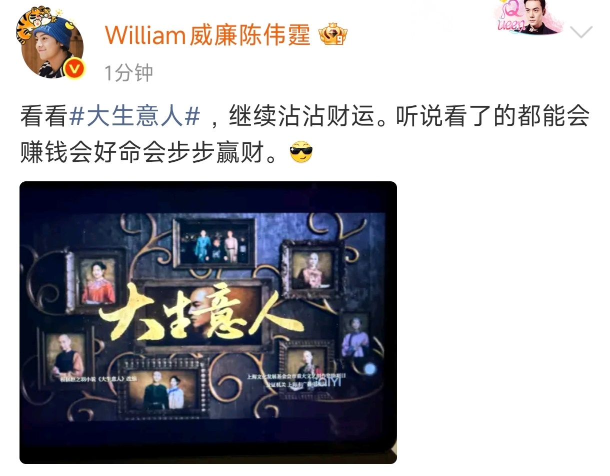 陈伟霆看看大生意人哇塞,陈伟霆也在看《大生意人》!哥说“继续沾沾财运。听说看了的都能会赚钱会好命会步步赢财。”跟着陈伟霆当好命人陈伟霆也在看大生意人陈伟霆在看大生意人