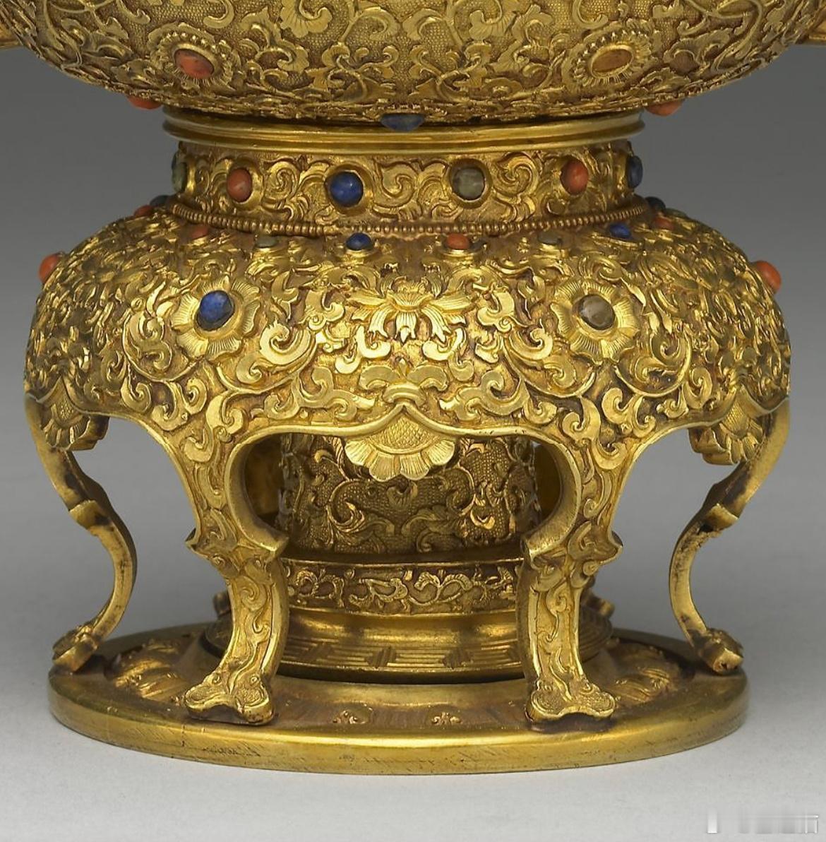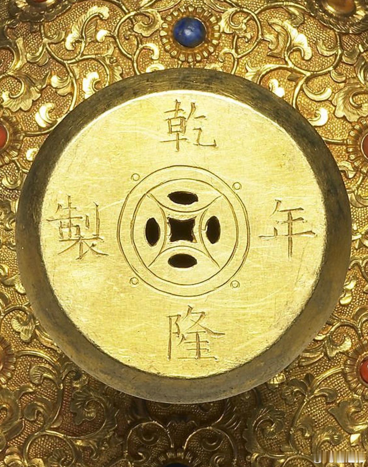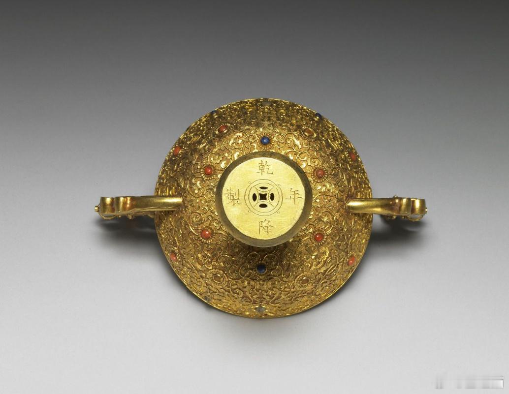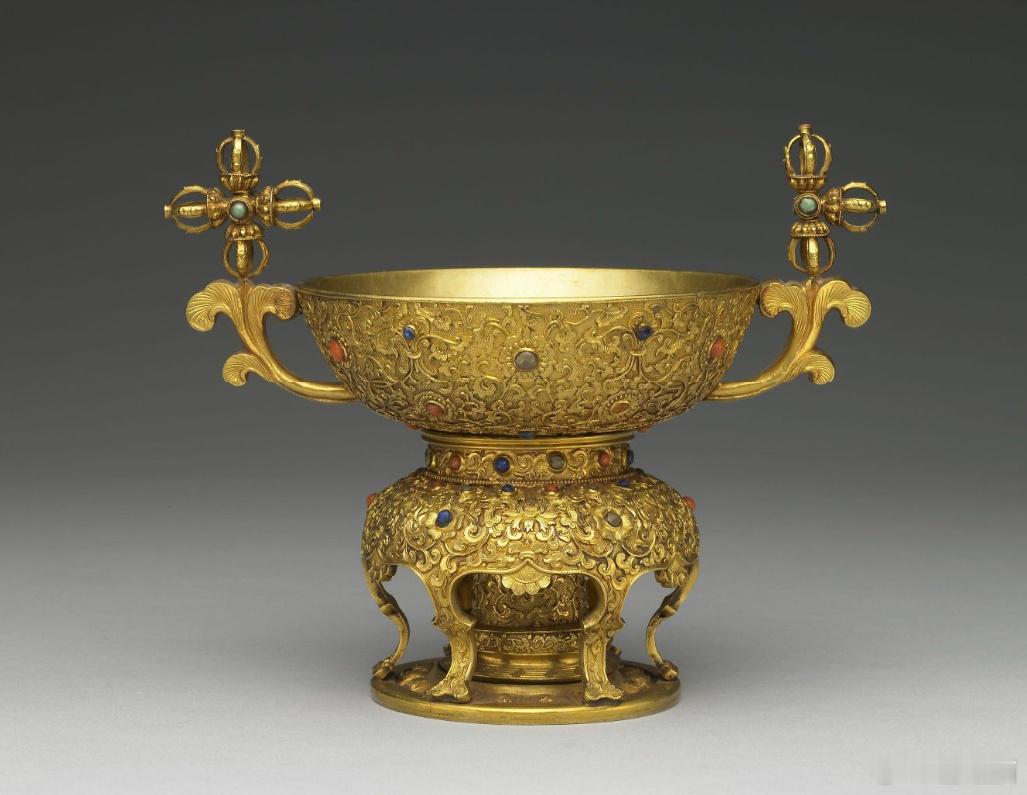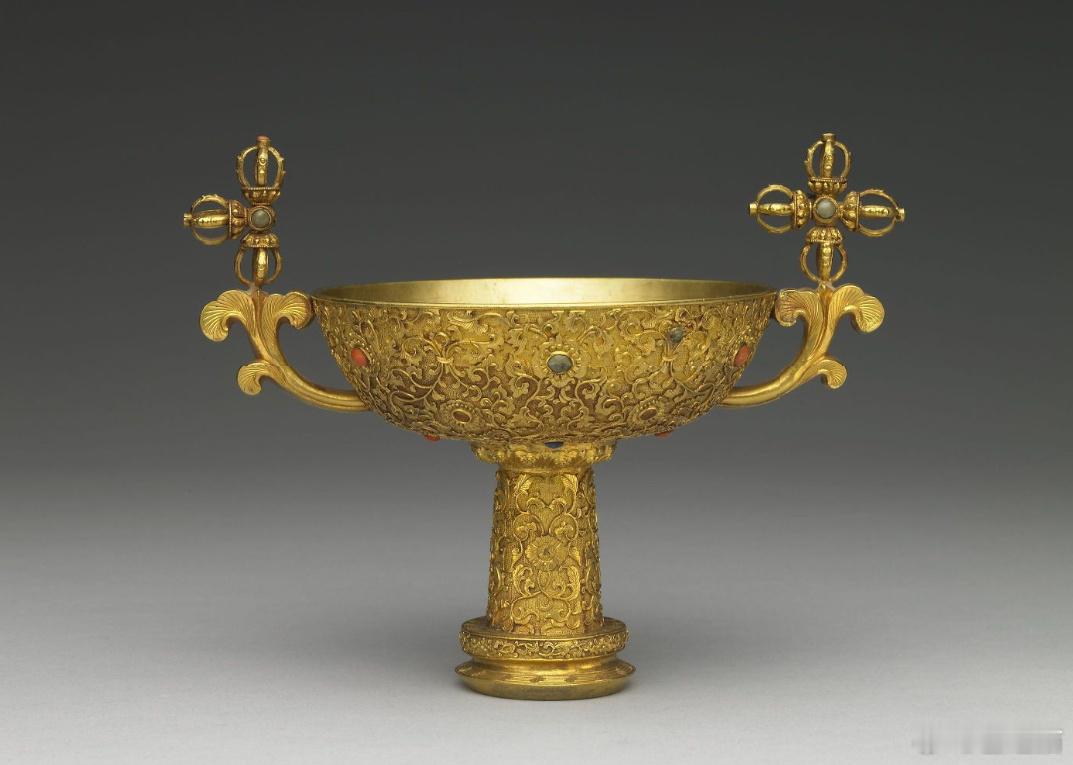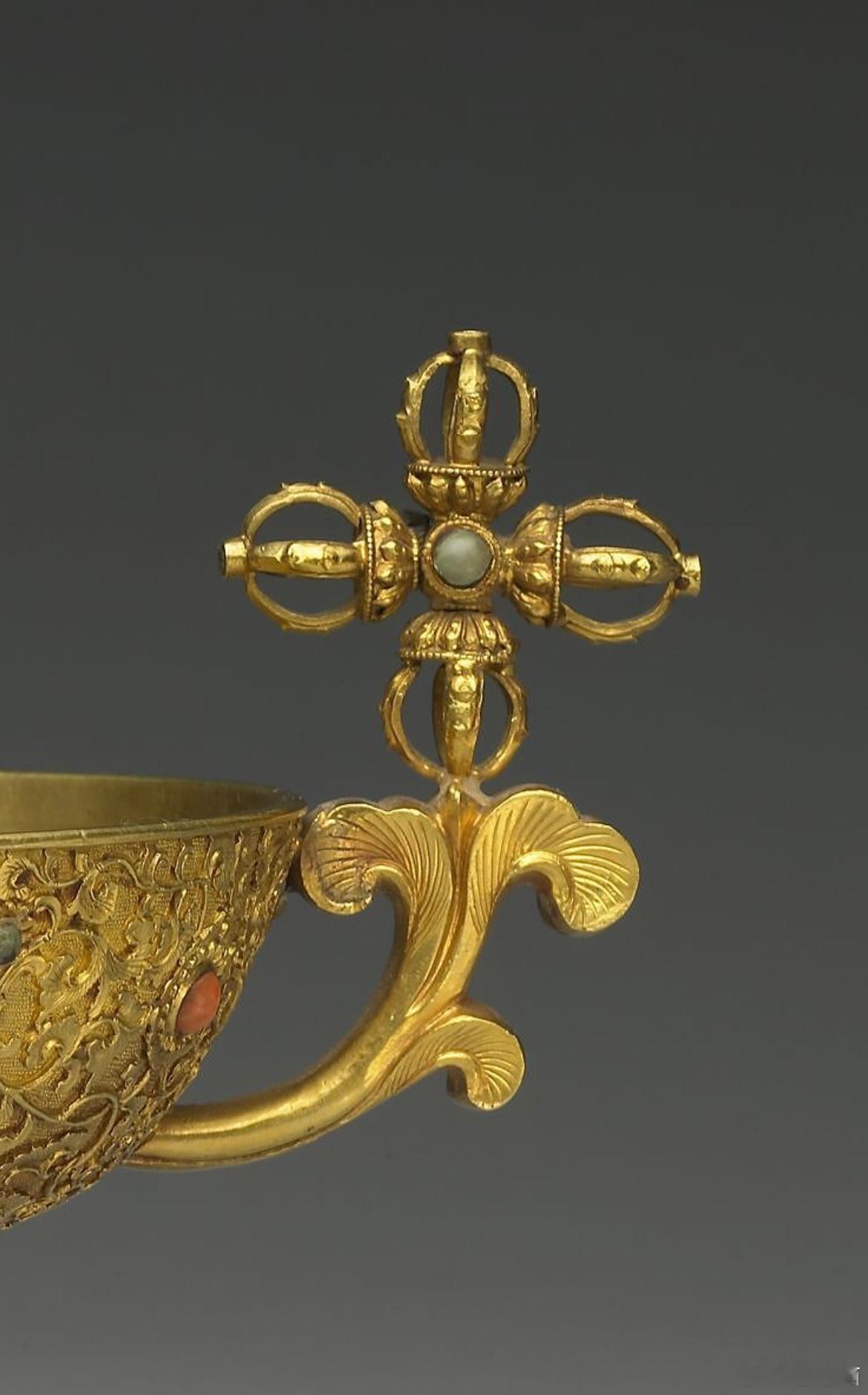 金嵌松石碗,台北故宫博物院/藏足底刻「乾隆年制」款。清宫作品,乾隆时期。高足碗放置在几状托内。碗的双耳呈卷叶状向上托起十字杵。碗与托之外壁均浮雕番莲花,卷枝细密,錾珍珠地,镀金沈厚,并嵌松绿石﹑青金石﹑珊瑚。碗足底镂钱文,并刻乾隆款。