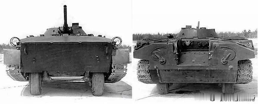 苏联的911工程 20世纪60年代初,苏联正大力研发一种极具发展前景的步兵战车。伏尔加格勒拖拉机厂设计局提出了自己的方案——911工程,采用轮式和履带式混合驱动系统。该车与765工程和914工程展开了激烈的竞争,每个设计团队都展示了各自设计的优势。 其主要设计理念是使车辆在公路上以轮式行驶时能够快速移动,并在越野时放下履带。这套系统非常巧妙:切换到履带模式时,特殊的液压缸会抬起车体,后轴的驱动轮便开始作为履带的驱动轮。在测试中,该车表现出色,在公路上以轮式行驶时速度可达70公里/小时。 该车武器装备包括一个未来步兵战车通用的标准炮塔,上面安装着一门73毫米“雷鸣”火炮和一挺同轴PKT机枪。三名乘员和八名伞兵被安置在一个略显狭窄但设计精良的车体内部。装甲只能抵御子弹和弹片。 有趣的事实: 在国家试验期间,911工程接受了一项独特的测试——在行进中从轮式切换到履带式。该车辆成功完成了这项任务,但委员会指出其设计过于复杂。这正是它最终被放弃批量生产的主要原因——军方更倾向于765工程的全履带式设计,该设计更为简单可靠,后来发展成为著名的BMP-1步兵战车(如图2所示)。