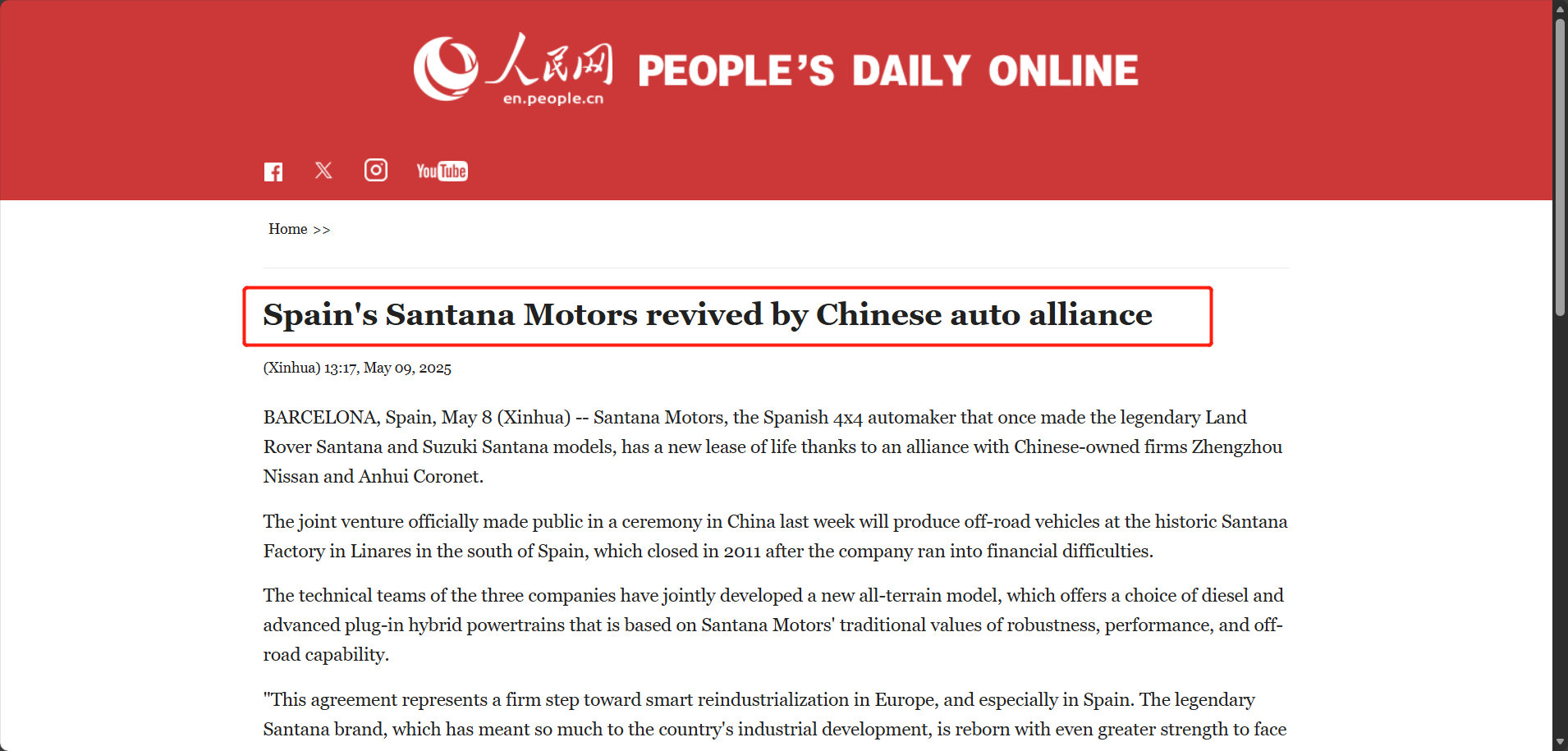 沉睡 14 年的西班牙品牌Santana,被中国企业重新点燃。郑州日产和安徽科洛内特把 Santana 又从“历史书”里拉了出来。两家中国企业联手推动 Linares 的老工厂重启,带来的第一批车有柴油版也有插混版,新车已经开始下线。现场那天阵仗不小,安达卢西亚自治区主席、第一副首相和 Linares 市长都来了,Santana CEO 还把复活后的第一辆车交给了商会。(图2)真正的重头戏在后面。Santana 与北汽集团正式签下战略合作协议,从 2026 年年中开始,Linares 将开始组装面向欧洲市场的 SUV 和越野车。整车以 SKD 形式从中国发往西班牙,在当地完成组装后进入欧洲市场。说白了,就是要做一个“技术 + 品牌 + 本地制造”的新模式:北汽提供平台与核心技术,Santana 做品牌、设计和欧洲市场的适应性工作。这种中欧联合开发、本地化生产的方式,在欧洲汽车工业里其实已经越来越主流,但像这样让一座停转十几年的传统工厂彻底“复活”的案例并不多。对 Linares 来说,工厂重启意味着就业、产业链回流、本地零部件需求重新增长。对 Santana 来说,是一次品牌重建的窗口。对北汽而言,则是一次在欧洲深度扎根、参与本地工业体系的机会。当一个沉睡多年的品牌重新发动机、重新把车开下生产线时,它背后的意义往往比一台车本身更大。大v聊车电车出海santana