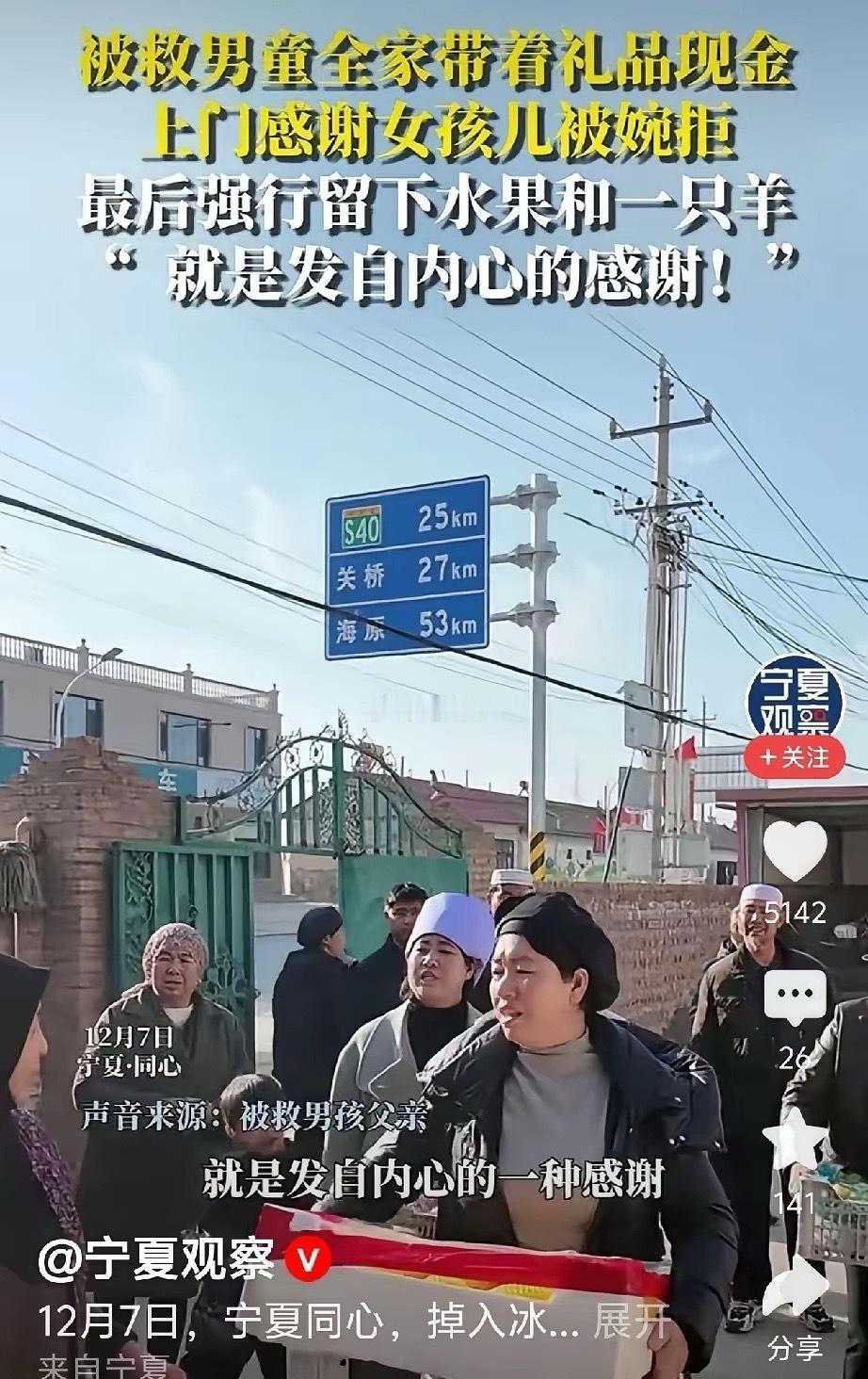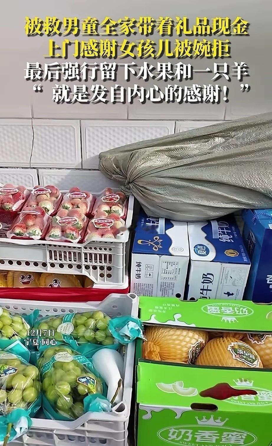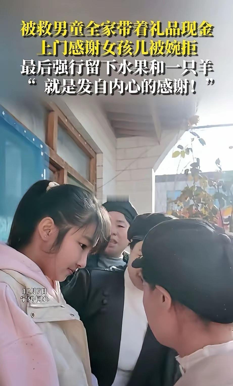 双向奔赴! 被救男孩的家人带着礼物和现金来感谢李佳婷,但是李家说什么都不肯收。 而男童家人说什么都要送,说就是发自内心的感谢,不收这辈子都会愧疚,最后强行留下水果和一只羊跑了。 据了解,李佳婷今年13岁,刚上初中,事发当天看到小男孩掉进冰窟窿里了,由于冰面太薄,岸上的人不敢轻易下去救人,怕对孩子造成二次伤害。 就在这时,李佳婷主动站出来,说自己体重比较轻,可以尝试一下。 于是她拿着热心市民递给她的管子小心翼翼的往男孩身边靠近。 可就在李佳婷把管子递给男孩后,自己也掉进了水里。 好在救援人员迅速赶到,将两人迅速救起。 李佳婷上岸后,转身就回家了,父母问她怎么把衣服打湿了,她撒了一个谎,说是洒水车洒水时没来得及躲开给浇湿的,估计当时是怕父母知道真相后会责怪她。 直到男孩家人带着礼物上门感谢,李佳婷的父母才知道真相。 李佳婷的父母说:“我们没有责怪孩子,我们为女儿的勇敢感到骄傲!”
