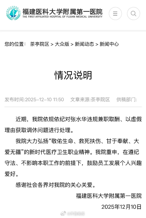 【#医院否认张水华离职#:尚未收到她的辞职申请】12月10日,福建医科大学附属第一医院发布情况说明称,依规依纪对“最快女护士”张水华违规兼职取酬、以虚假理由获取调休问题进行处理。今日有消息称,张水华已从该院离职。今日下午,记者联系该院院长康德智询问张水华是否离职,他短信回复称“没有”。康德智表示,经询人力资源处,医院未收到她的辞职申请。11日16时许,记者拨通张水华丈夫电话询问,对方回应称:“我在忙。”随后挂断电话。(红星新闻)