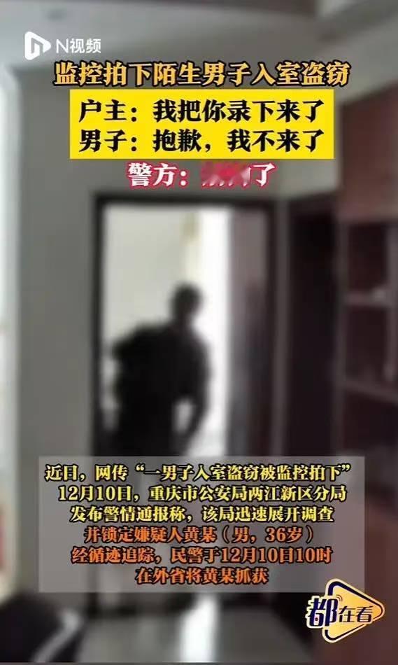 “离了个大谱!”重庆,一男子在看监控,发现家里进了一个陌生人,在屋内翻找物品,他意识到进贼了,于是告诉小偷已经把他录下来,没想到小偷情绪异常稳定,平静地对男子说:“抱歉,我不来了。”随后转身离开。网友:怪有礼貌的。 男子当时正用手机查看家里的实时监控,画面里突然冒出个陌生人,在自己客厅和卧室里不慌不忙地翻东西。男子赶紧通过监控的语音功能喊话,说自己已经全程录下来了,让他赶紧走。一般人做贼心虚,听到这话多半吓得魂飞魄散,要么逃跑要么求饶。 可这个小偷停下动作,转头看了看摄像头,居然像个走错门的邻居一样,淡定地回了一句:“抱歉,我不来了。”语气平静的说完真的就转身开门,不紧不慢地离开了。 有人说这小偷“心理素质过硬”,有人感叹“这年头,连小偷的告别语都这么客气”。但是真玩笑归玩笑,光天化日之下,小偷能轻易进入屋内,这事背后挺让人后怕的,说明家里的防盗门锁可能有问题。幸亏男子装了远程监控,及时发现并吓退了小偷,否则损失可能就大了。 小偷不像是临时起意的新手,面对暴露和警告毫不慌乱,心理素质非同一般。科技安防设备越来越普及,像监控摄像头、电子门锁,关键时刻真能起作用。 人不在家时,家里静悄悄,就成了某些人眼里的“机会”。多一点警惕,多一道防线,才能让这些不速之客连门都找不到,更别说进来“道歉”了。 各位读者你们怎么看?欢迎在评论区讨论。