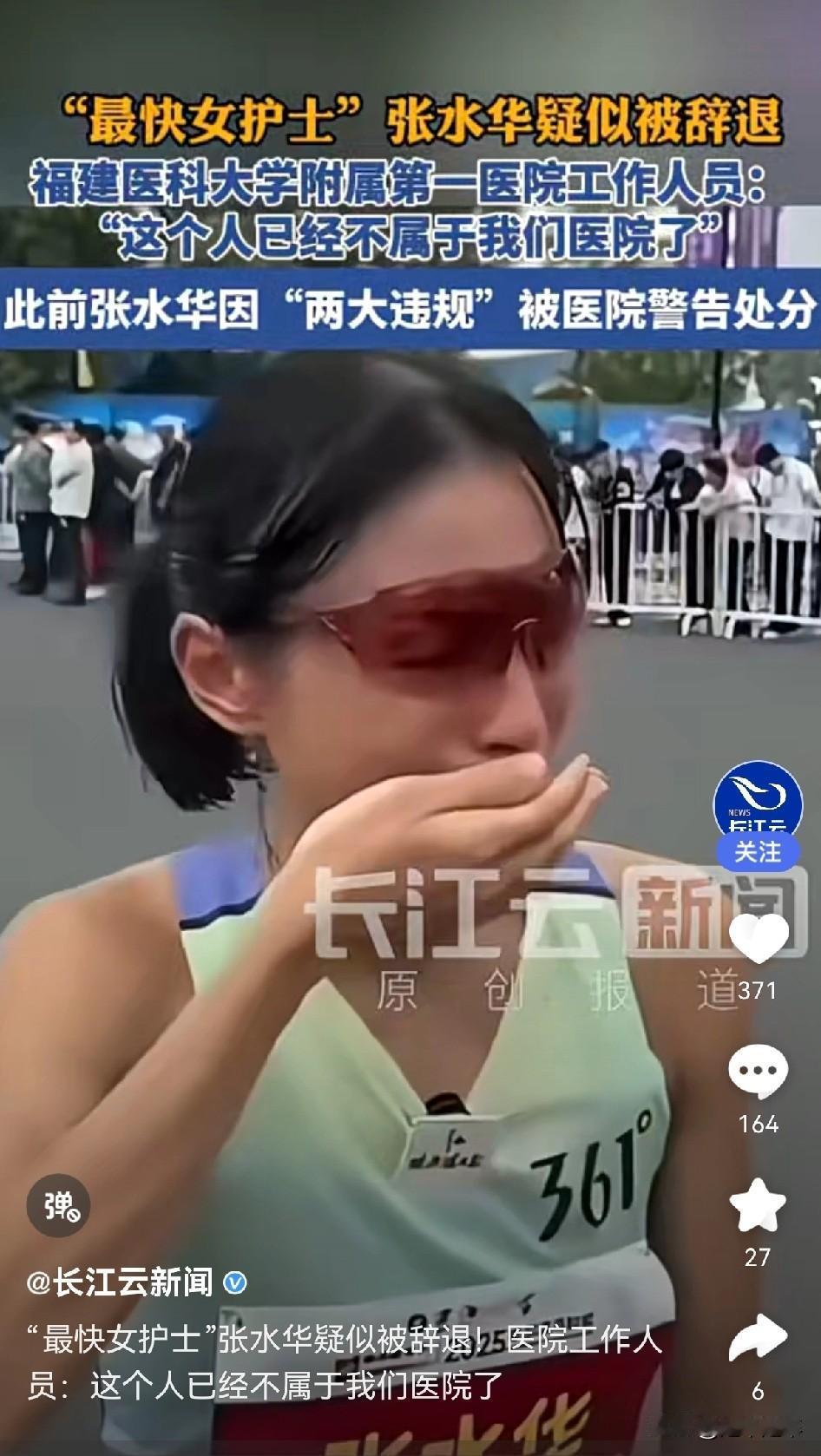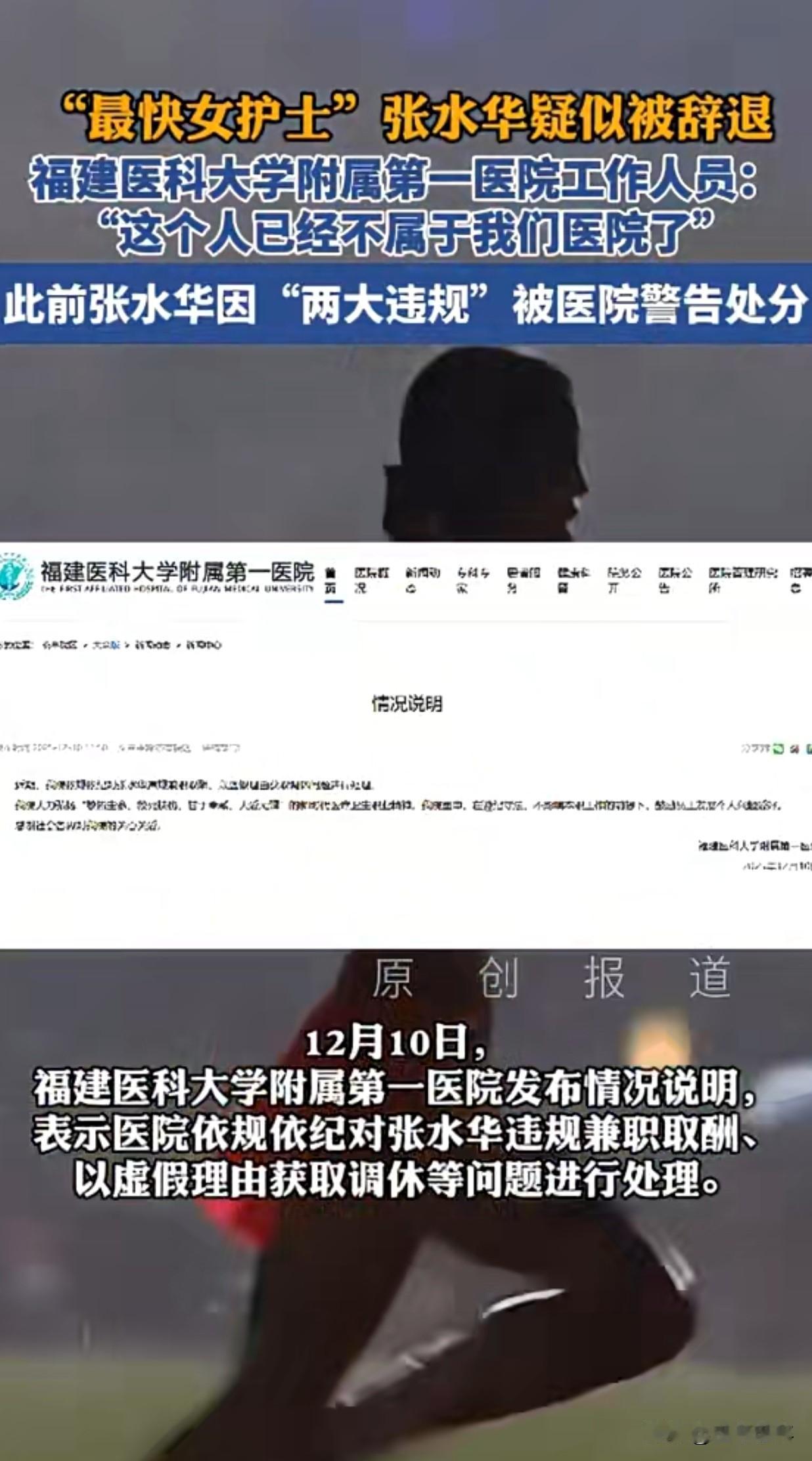 最快女护士张水华疑似被辞退福建医科大学附属第一医院工作人员称:这个人已经不属于我们医院了。 福建医科大学附属第一医院工作人员向媒体证实,“最快女护士”张水华已不属于该院员工,这个表态源于12月11日长江云新闻的报道,持续数月的“跑马护士”争议迎来结局。 张水华从今年8月哈尔滨马拉松夺冠后哭诉“求领导支持调休”,引舆论争议。9月签约361°代言,但因舆论压力被品牌火速解约。12月9日医院内部处分文件泄露,曝光其50天内参赛5场、奖金超20万元,12月10日院方通报坐实处分,次日传出离职消息。 这样的结果很不错,既然你自己都在违规兼职获得了不少的利益,还在媒体上公开抱怨单位领导,以谎言调休。牺牲同事权益成全个人事业,破坏团队协作,并触碰事业单位管理红线。已经是精致利己主义的代表了。 她自己在之前还声称:“跑马不影响工作”,称跑后精神状态更佳,强调绝不辞职,“需工作养活自己和孩子”这下鸡飞蛋打了吧。 根据《事业单位工作人员处分规定》,虚假调休可定性为“破坏正常工作秩序”,兼职未报批则直接违反禁止营利性活动的条款,最重可至开除。 截至12月11日,张水华本人未公开回应离职一事。其社交媒体账号已关闭评论。